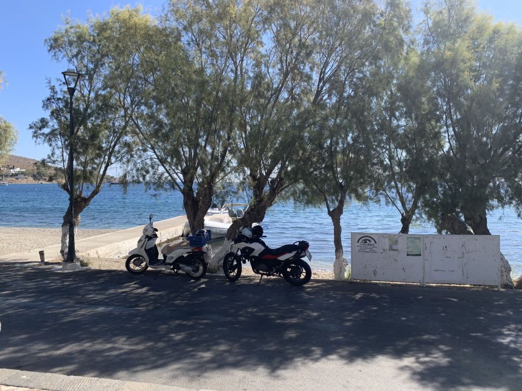 Für unser Mopped findet sich ein lauschiges Plätzchen im Schatten, das Gepäck verblieb im Hotel – an Badesachen hatten wir natürlich gedacht!