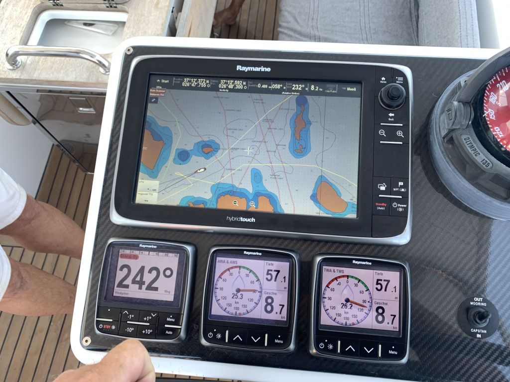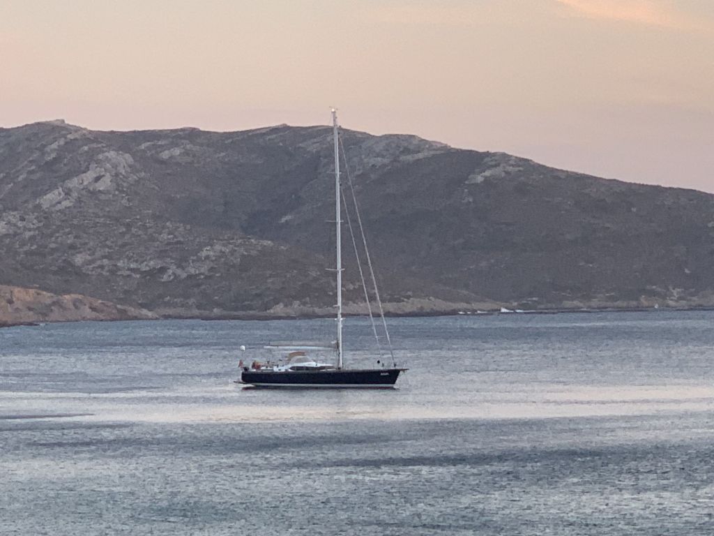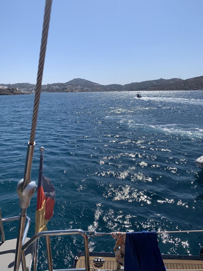 Spaß beiseite – wir hatten unseren Freund Marcus informiert, dass wir Kurs Lipsi gesetzt haben. Marcus wohnt mit seiner Familie auf Lipsi, es war klar, dass wir zumindest Bescheid geben, dass wir hier sind. So hat er uns natürlich von seiner Terrasse aus beobachtet und den Schnappschuss gesendet.