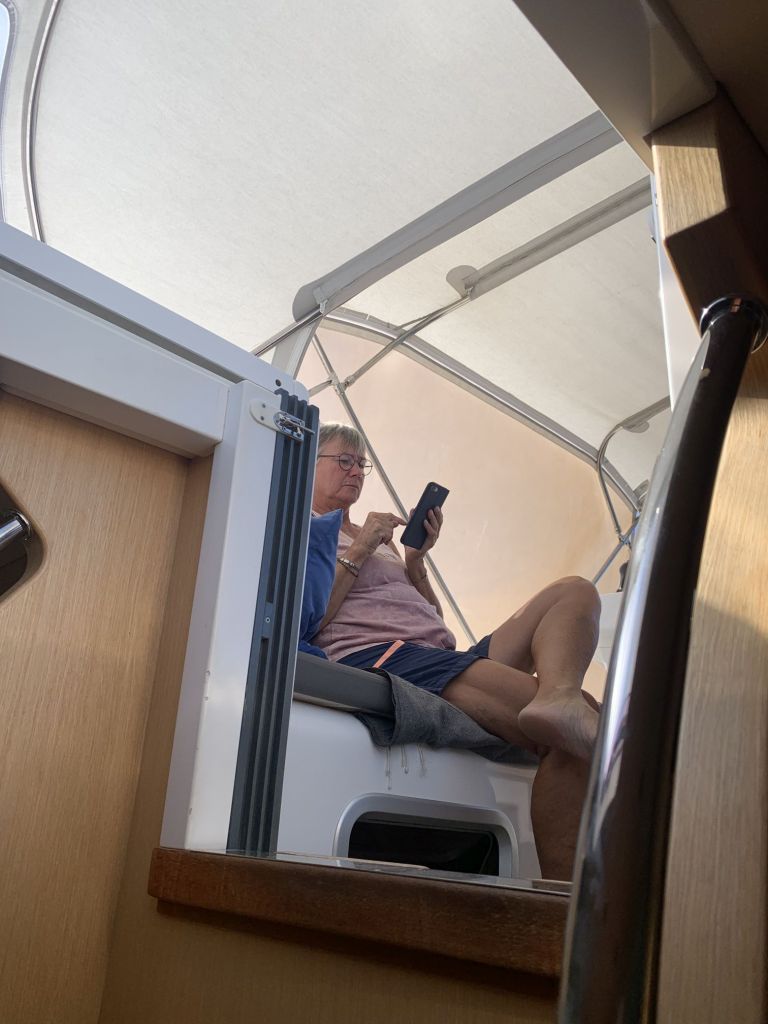 Wir sperren den Boliden ab, tragen erste Lebensmittel zu uns an Bord. Dabei kommen wir immer wieder an Thomas´ SIMPLY FREE vorbei. Wie wenn wir telepathisch verbunden wären, höre ich das vertraute BIMM von meinem Telefon – Thomas fragt, ob ich mal die Bilgenpumpe betätigen könne und mal nach dem Rechten sähe – klar, mach ich!