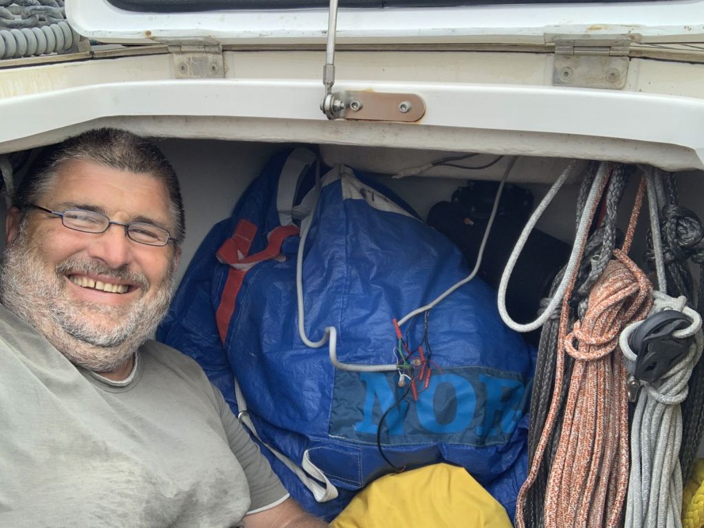 Ich muss einen Klettverschluss für eine Deckenverkleidung antackern. Dafür kraxle ich vom Schiff und gehe zum Segelmacher der Marina. Ich zeige ein Bild auf dem Handy und er gibt mir das benötigte Werkzeug – welches sich jedoch beim Einsatz als defekt herausstellt.