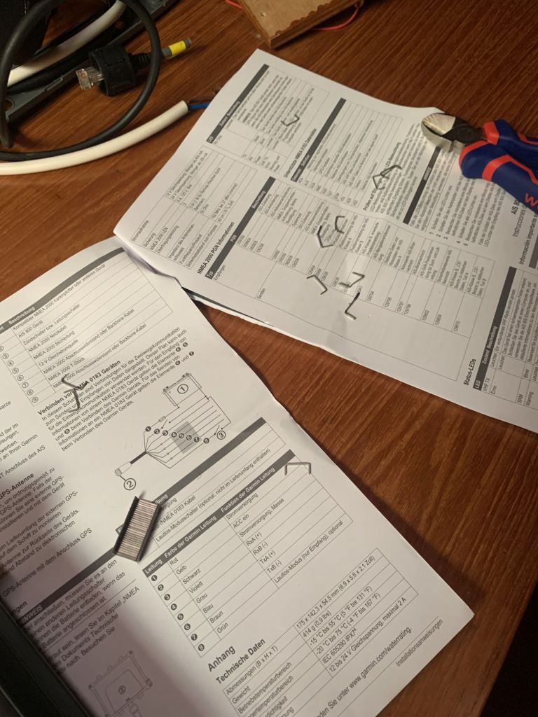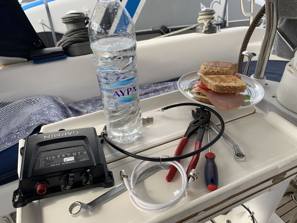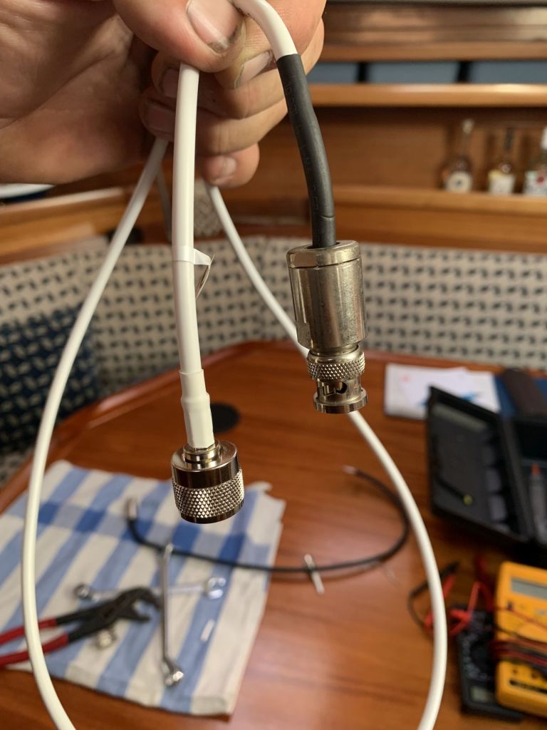Das vorhandene Antennenkabel des Schiffes passt nicht zum neuen AIS – was tun? Man palavert, beratschlagt sich. Man will Teile bestellen, Adapter, neue Kabel – alles richtige Optionen – aber hält das nicht auf? Könnte man sich nicht auf handwerkliche Fähigkeiten besinnen und den alten Stecker ans neue Kabel tüdeln? Natürlich fachmännisch korrekt, inclusive Lötung und Schrumpfschlauch!