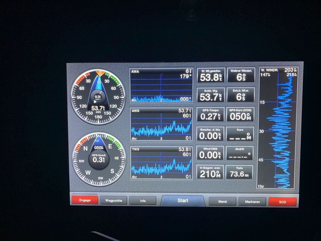 Auf dem Bildschirm sehe ich den Windpeak – 66kts – Orkanstärke! An einem der sichersten Plätze in einer griechischen Marina.