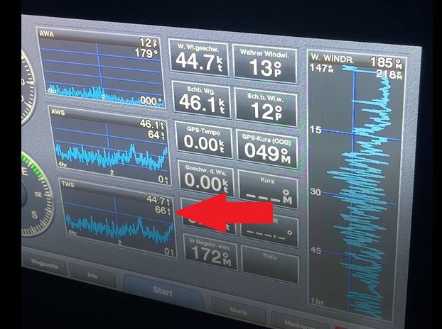 40kts, 45kts – jetzt zeigt Aeolus was er kann, fasten your seatbelt, jetzt geht es los!