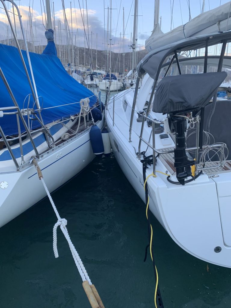Dem Skipper der an der Situation nicht ganz unschuldig war möchte ich sagen – „der Klügere gibt nach“ – er lässt sich nicht zum Helfen sehen als wir die nagelneue Hanse an seinen alten, klebrigen Fendern entlang, aus der Lücke herausfahren.
