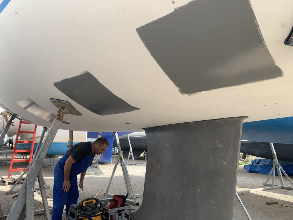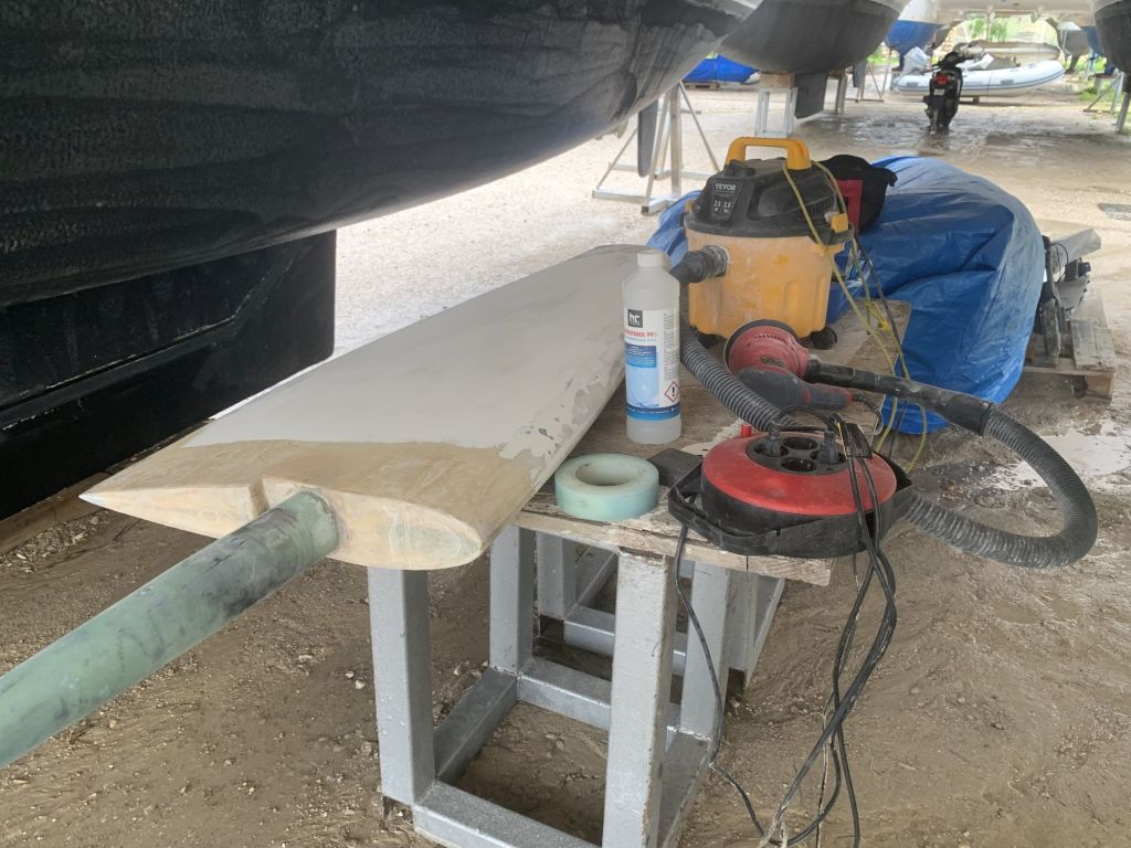 Derart gebrieft gehe ich an meinen Arbeitsplatz – mein erster Blick gilt dem Ruder, welches inzwischen einmal verspachtelt ist.