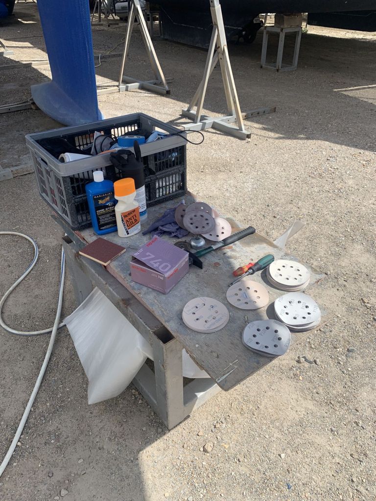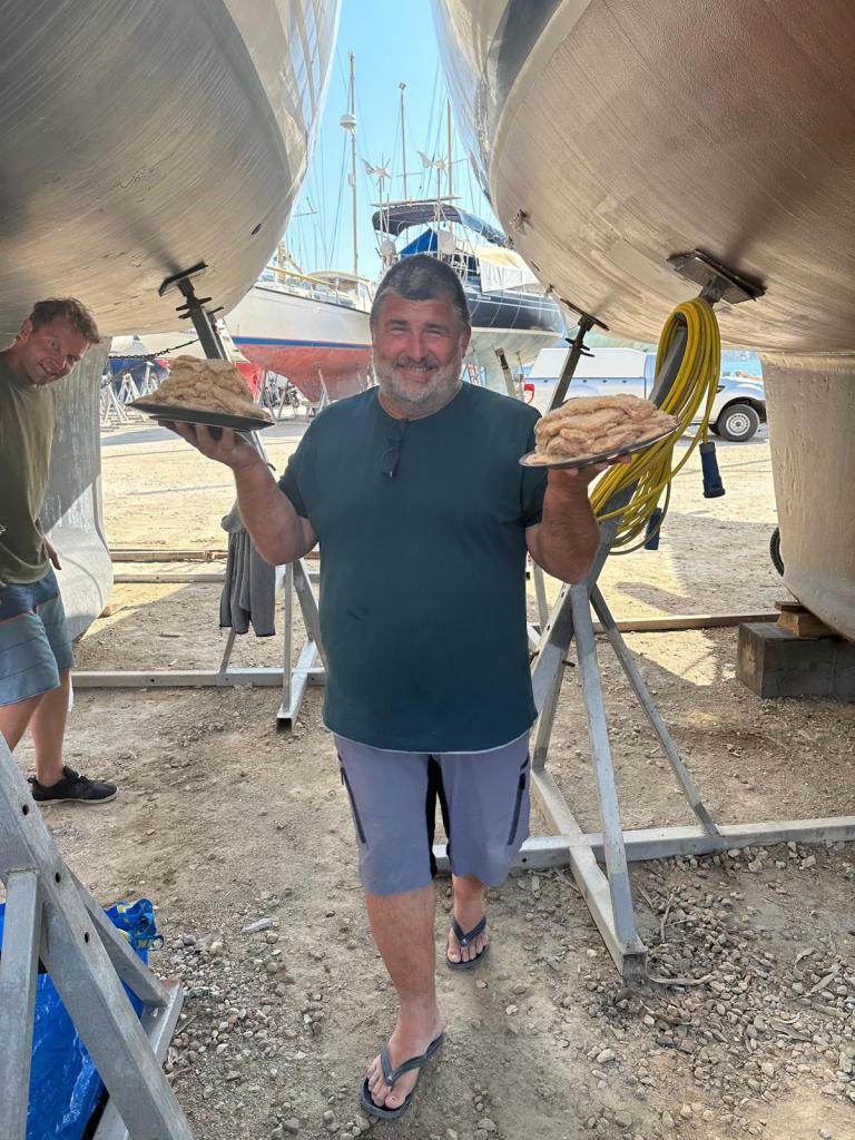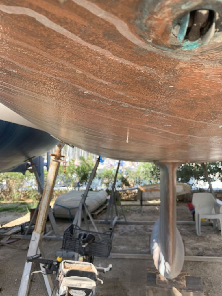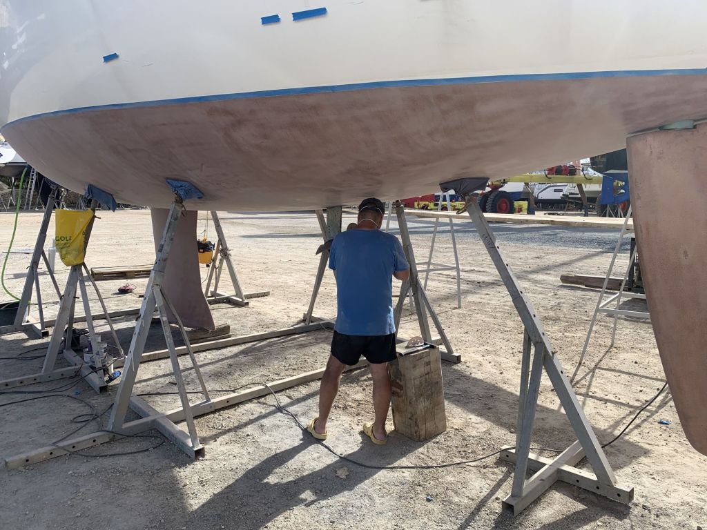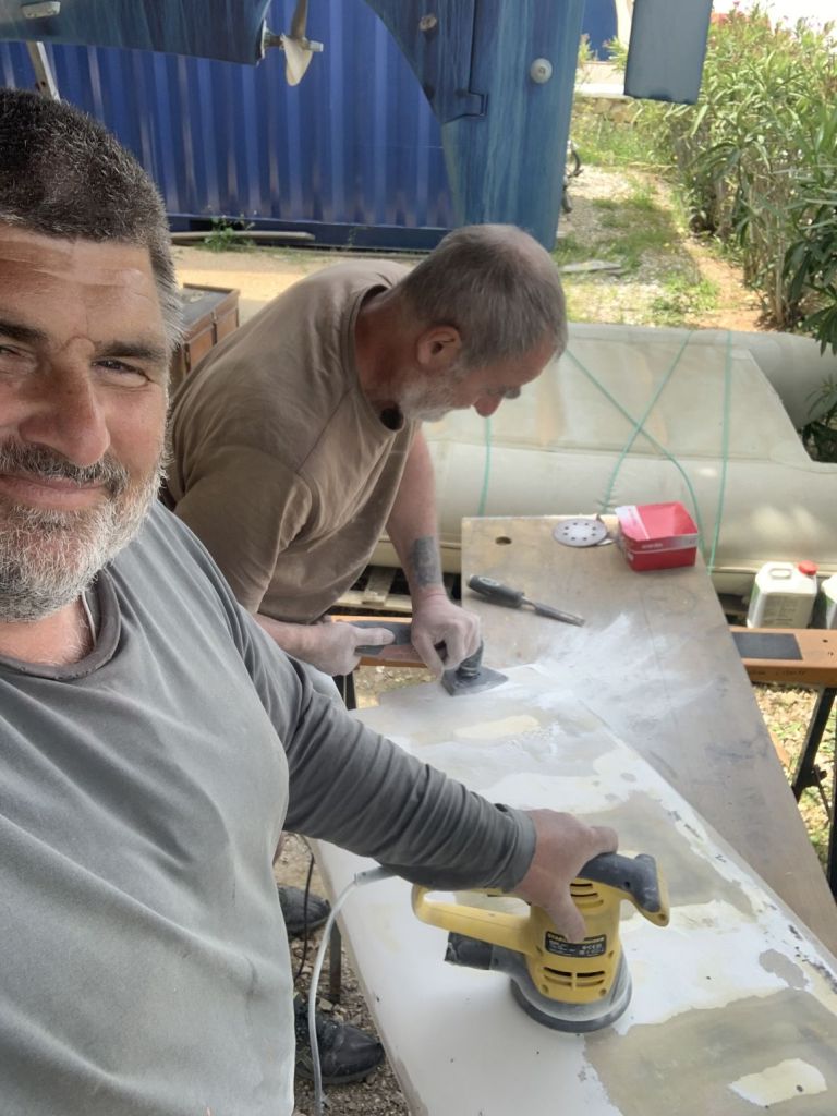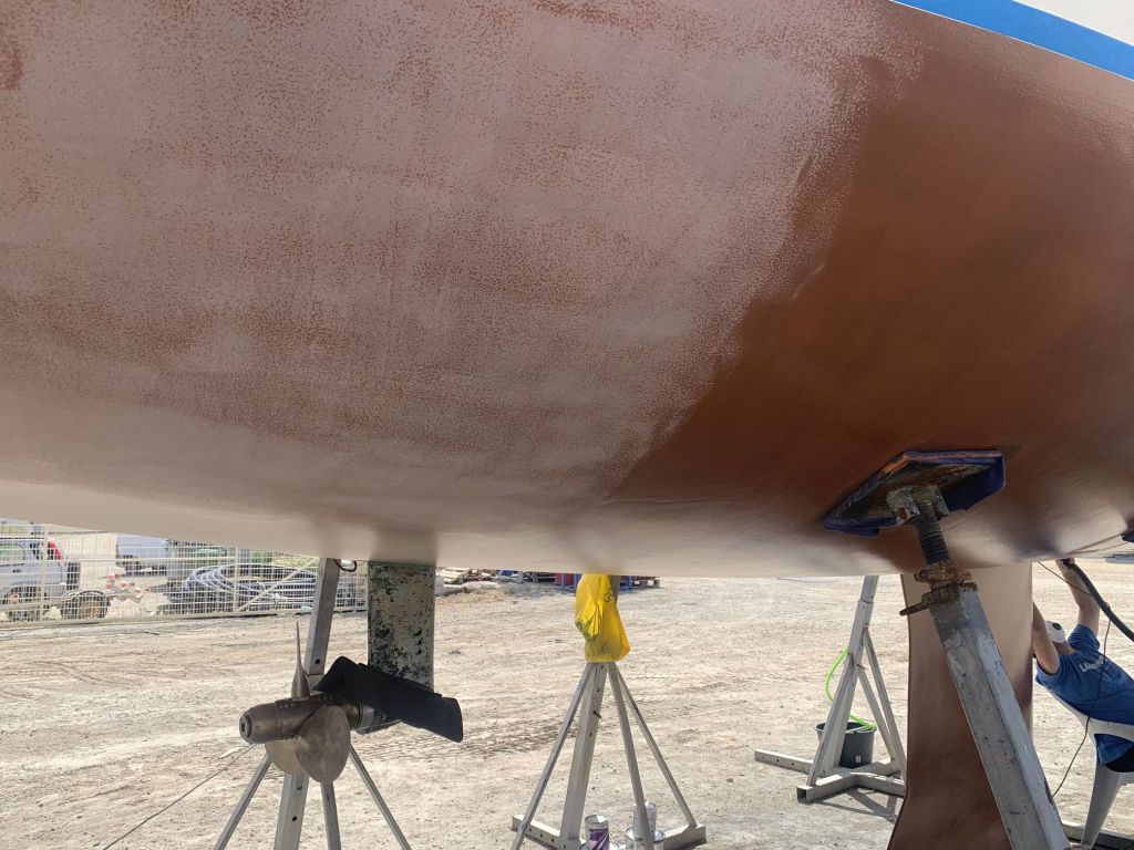 Das Schiff hat nach dem Schleifen fast hellbraun / hellrosa ausgesehen. So hat es auch ein Katamaran gemacht, welcher neben uns stand.