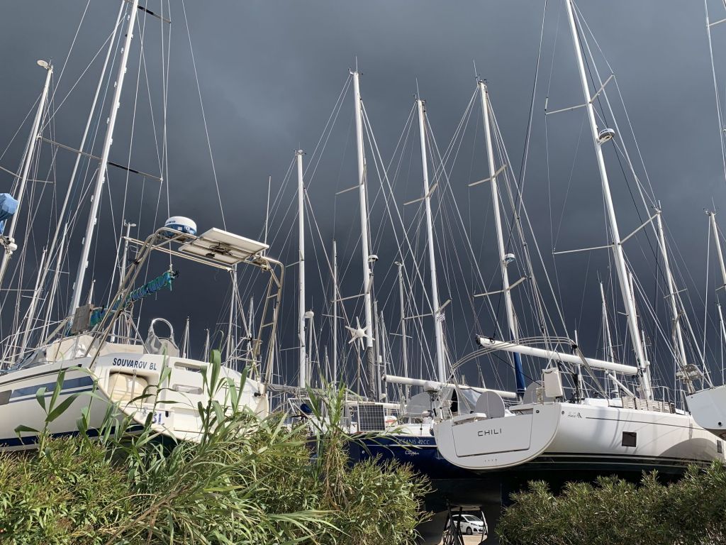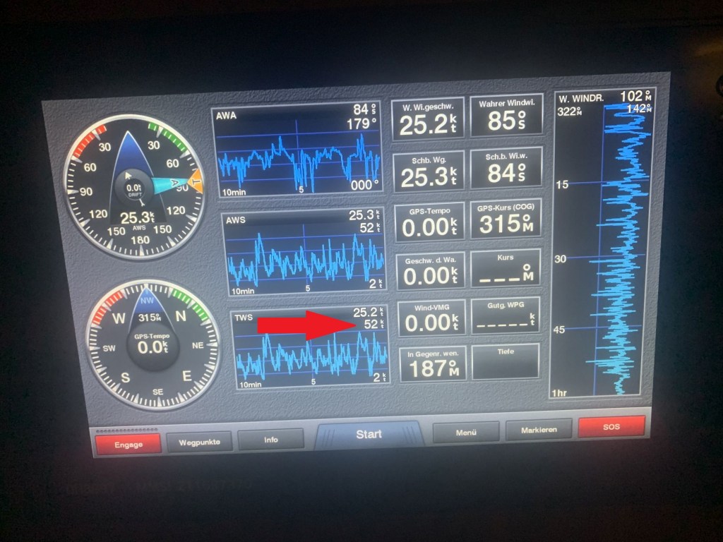 Der Wind frischte weiter auf und die Böen gingen hoch auf über 50kts, das ist Windstärke 10 – das merkt man selbst in der Marina, NESSAJA zerrt an ihren Festmachern.