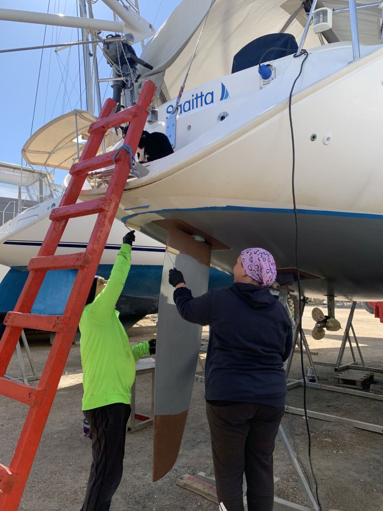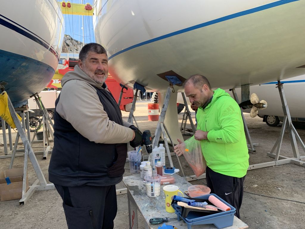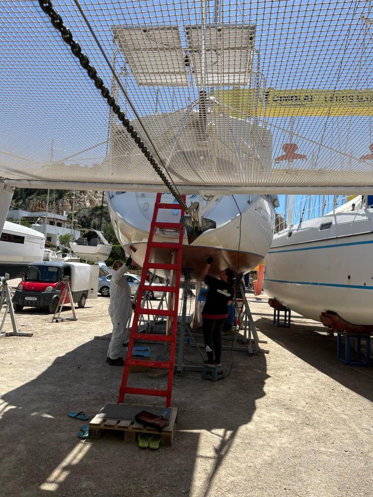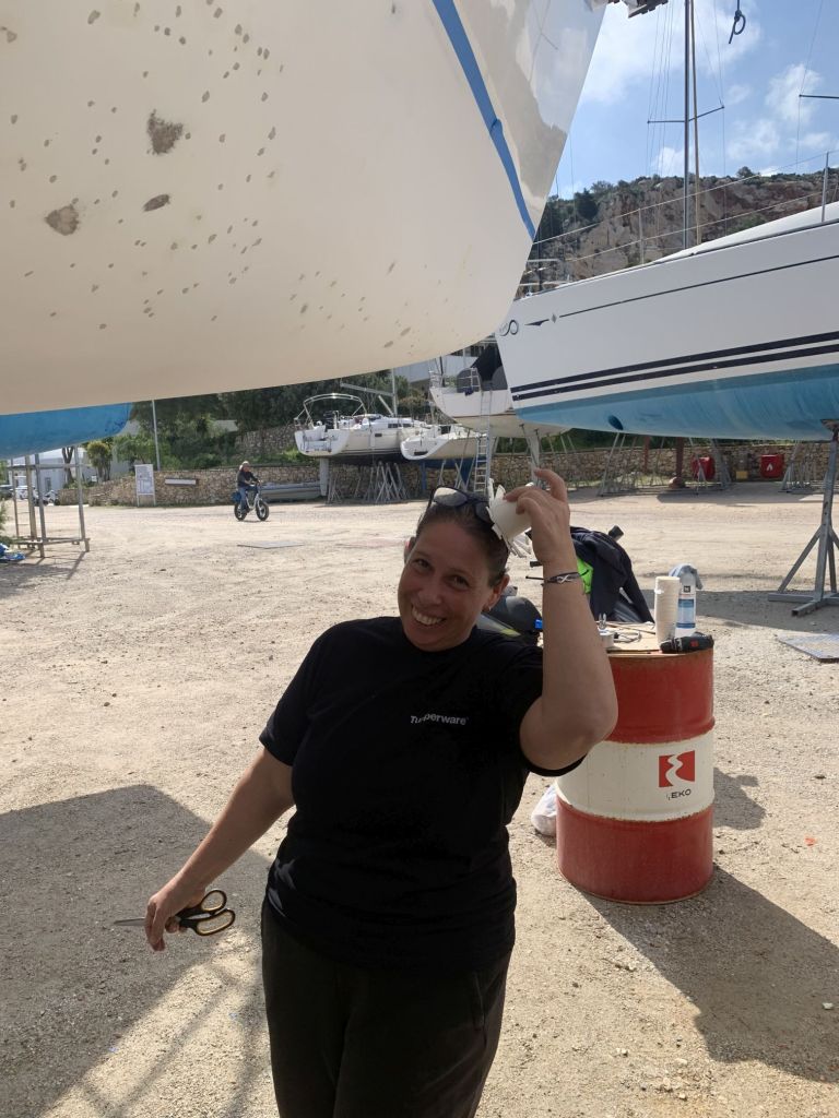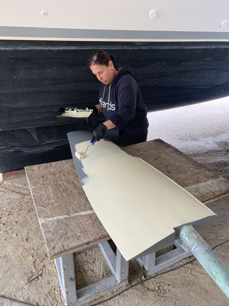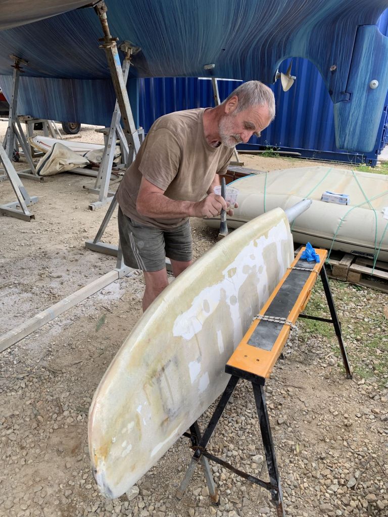 Eva streicht noch das Ruder, dieses liegt wettergeschützt unter einem Katamaran und kann auch bei Regenrisiko bearbeitet werden.