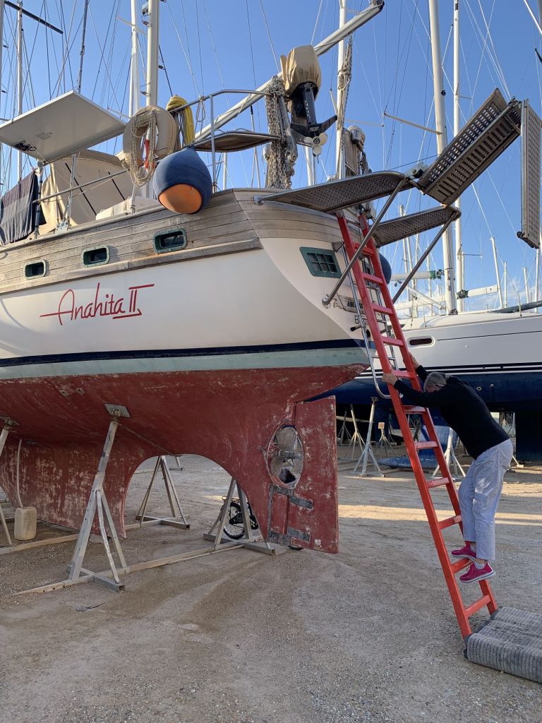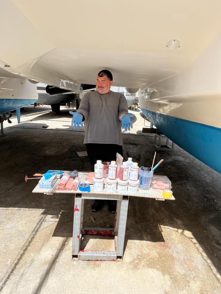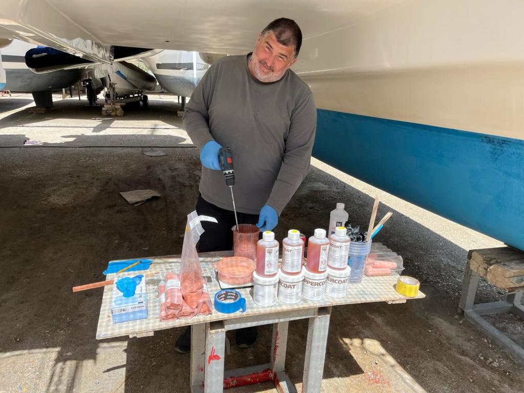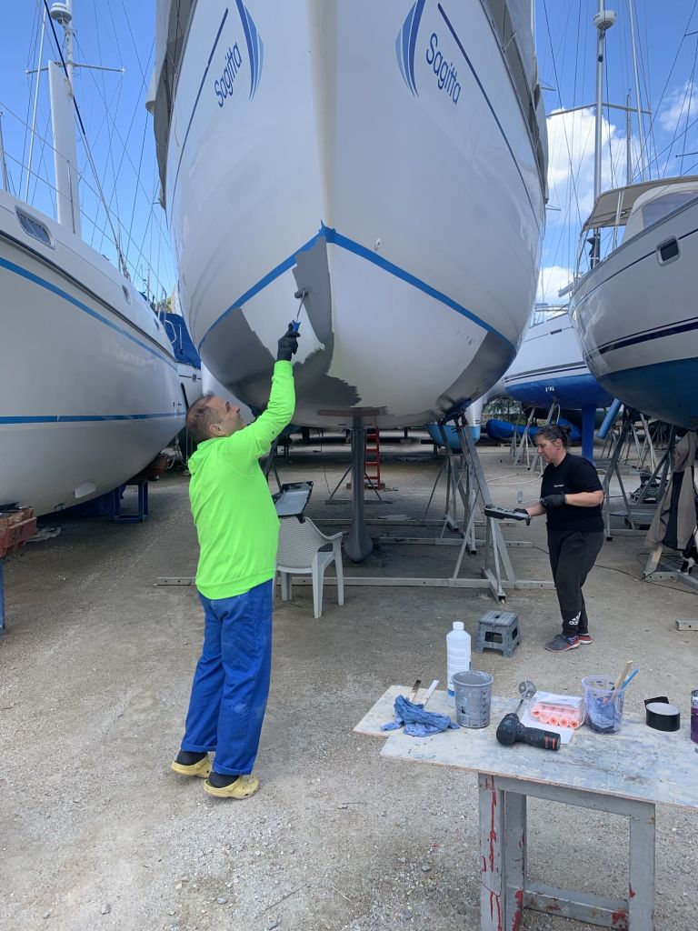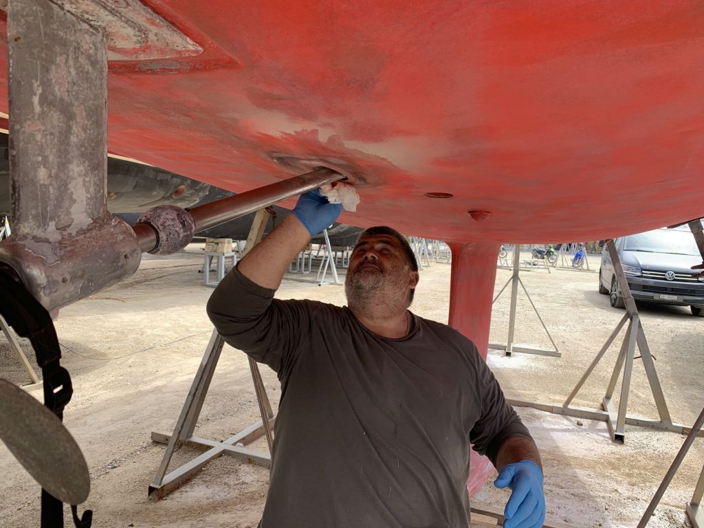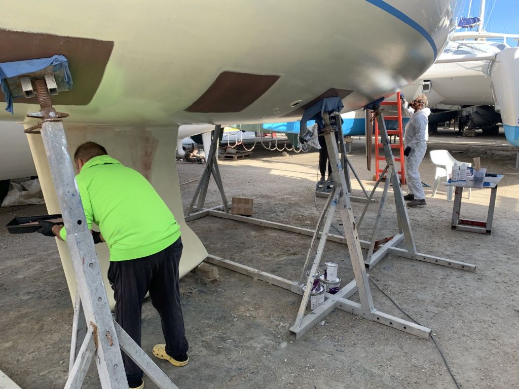 Eva streicht noch das Ruder, dieses liegt wettergeschützt unter einem Katamaran und kann auch bei Regenrisiko bearbeitet werden.