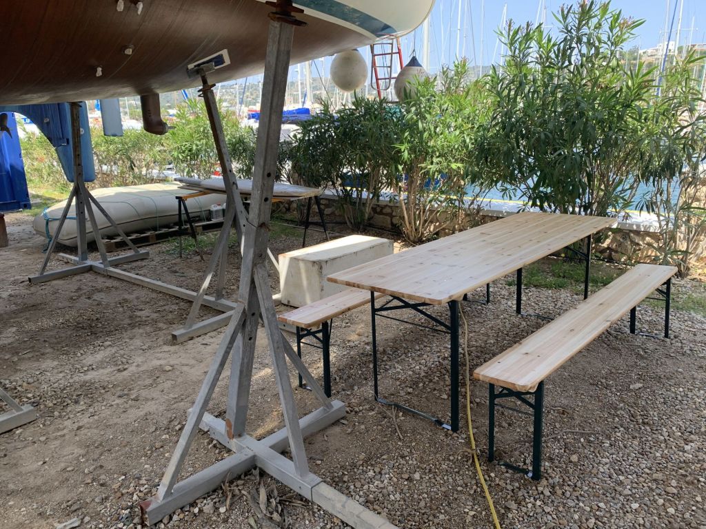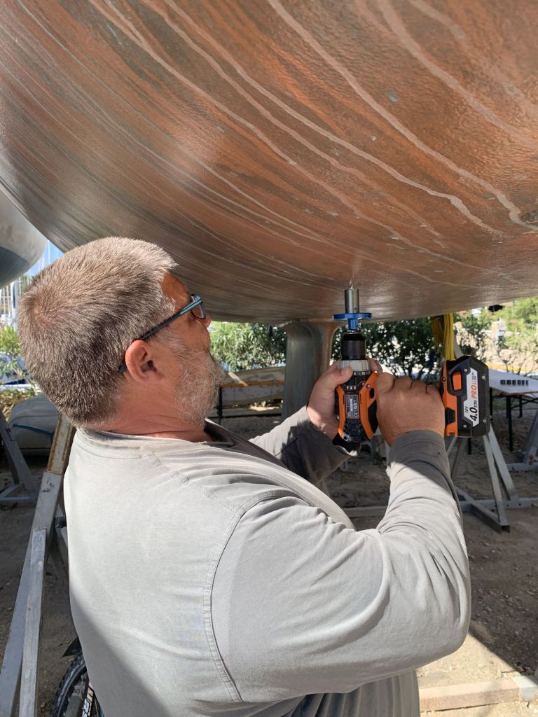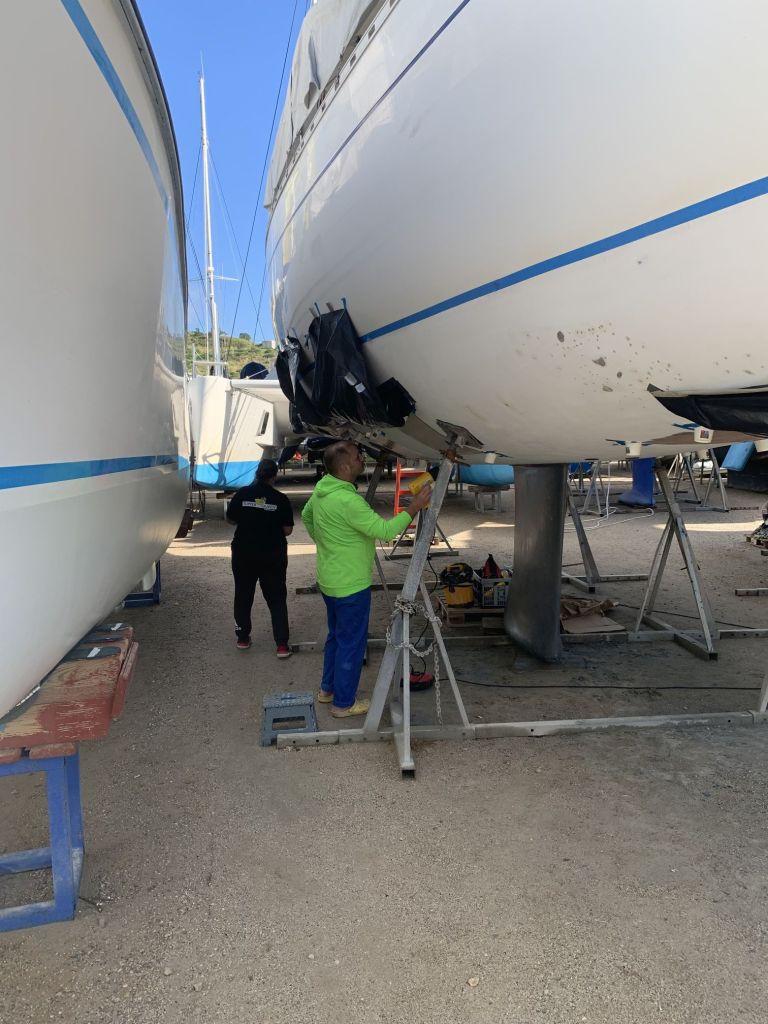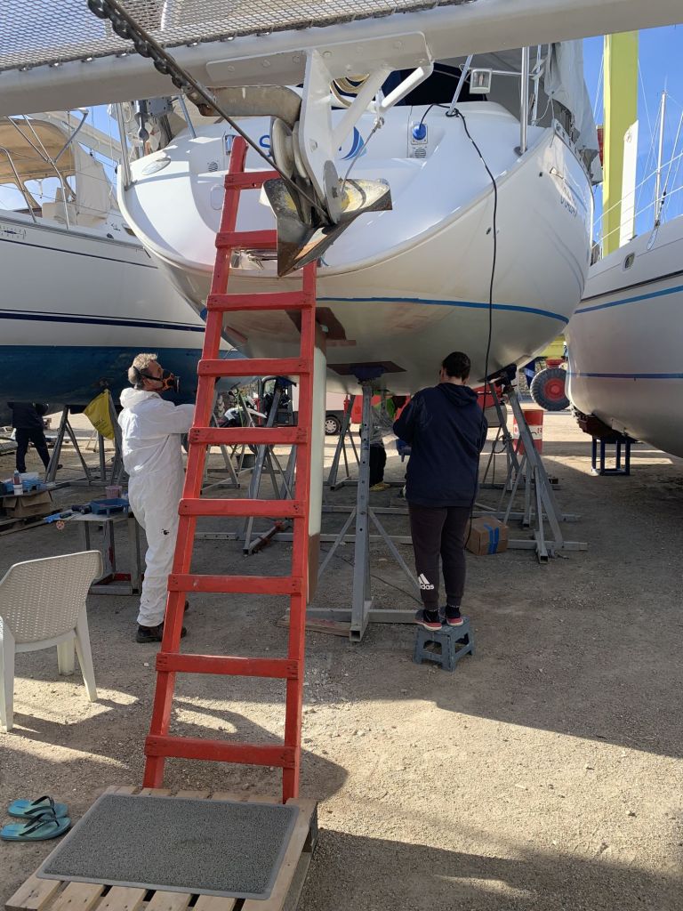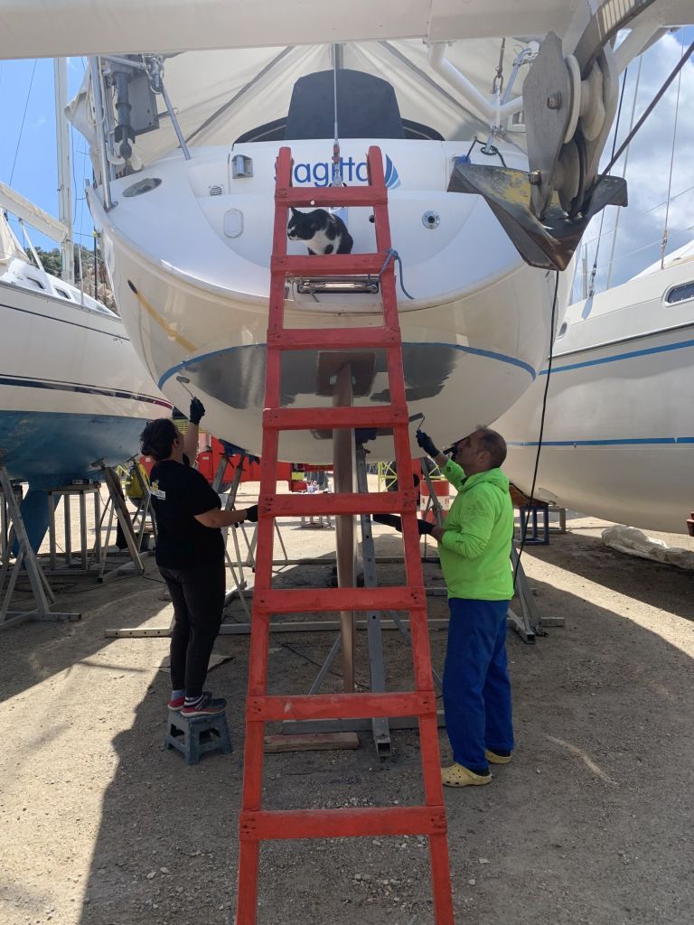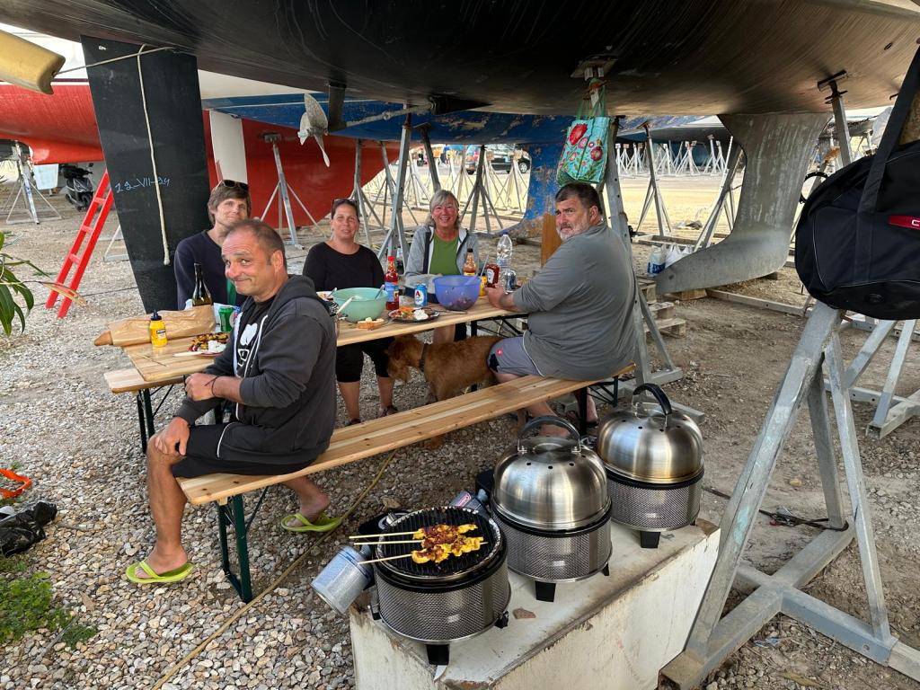 Eva streicht noch das Ruder, dieses liegt wettergeschützt unter einem Katamaran und kann auch bei Regenrisiko bearbeitet werden.