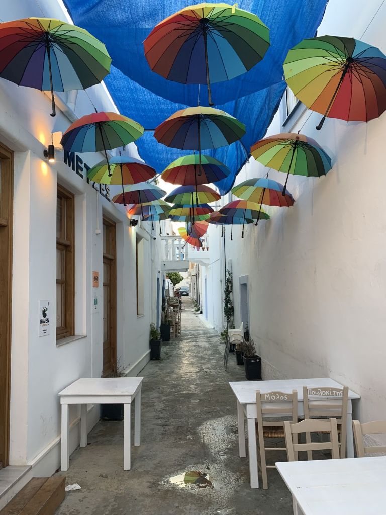 Im Sommer lädt die bestuhlte Gasse unter den Regenbogenschirmen zum Verweilen.