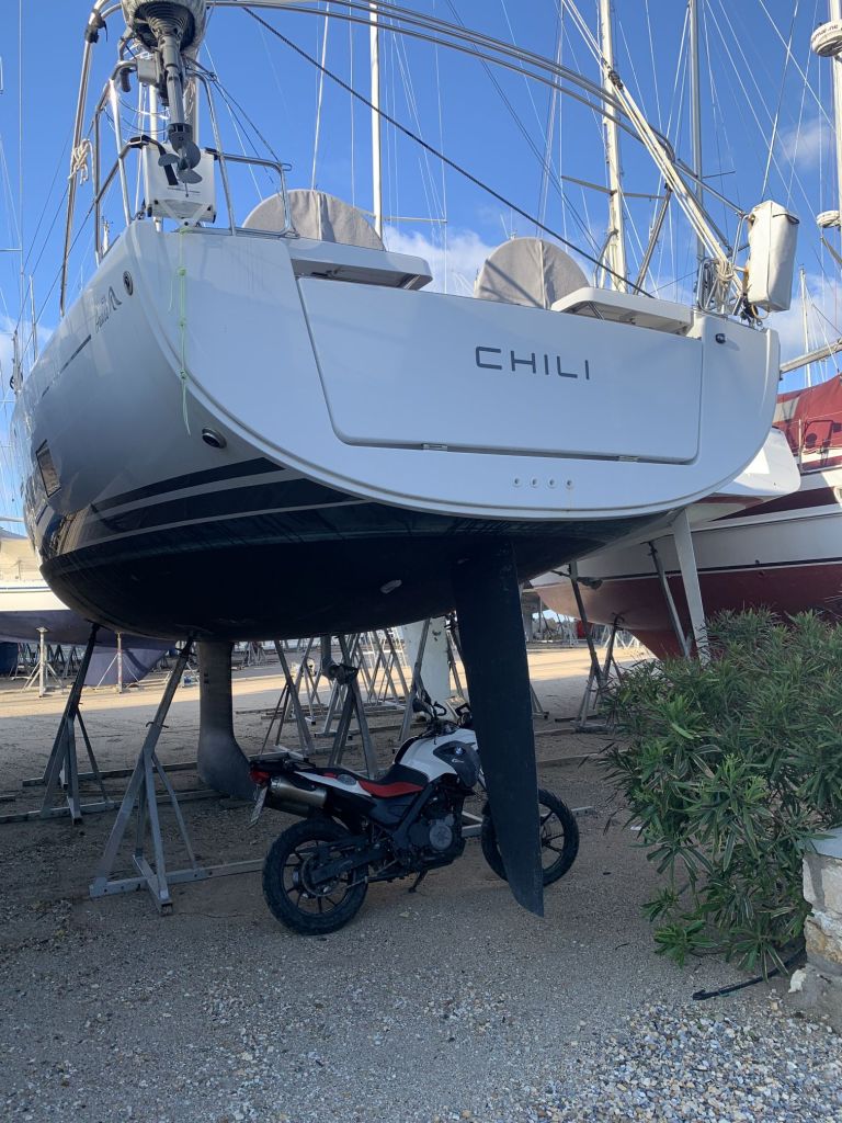 Der Zufall wollte es, dass genau so ein Motorrad heute in der Marina stand – ich habe ein Foto gemacht!