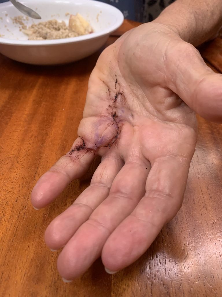 Die Narbe sieht schon ganz gut aus, ob ich das mit meinem „nautischen Nähtraining“ an einer Schweinshaxn auch so hinbekommen hätte???