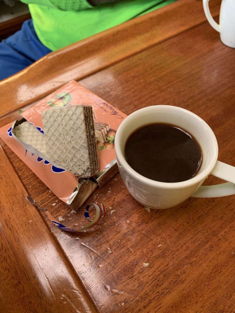 Am nächsten Morgen sitzen Sibylle und ich etwas länger bei Kaffee und Tee, das Wetter lädt nicht zum Verlassen des Schiffes.