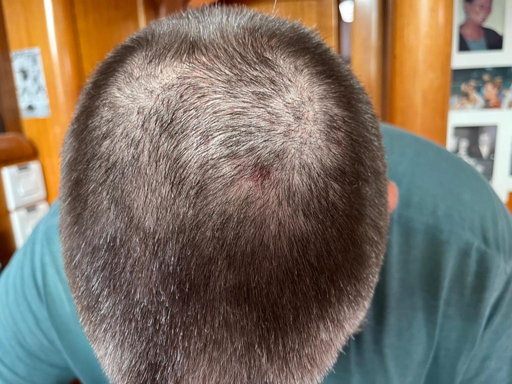 Ich erinnere mich, dass ich gestern dort gekratzt hatte. Wir beobachten die Stelle die nächsten Tage und der Fleck verschwindet fast völlig, nachdem ich ein medizinisches Shampoo verwendet habe.