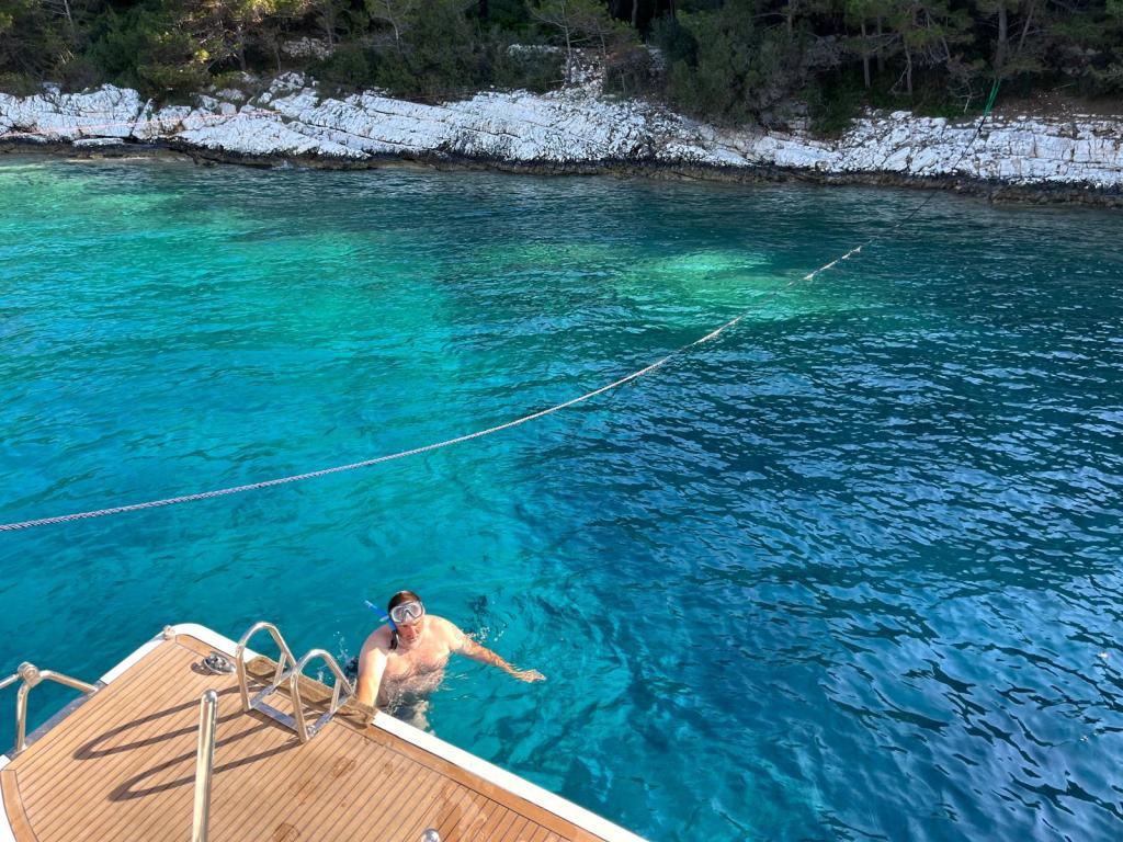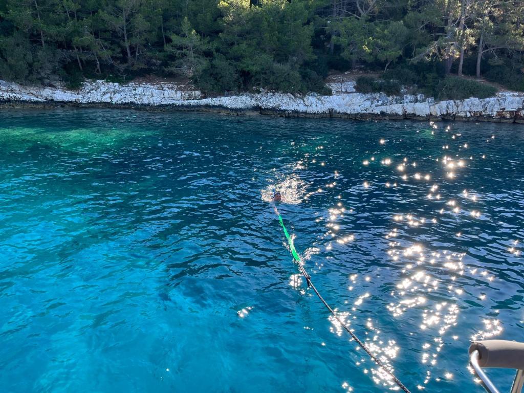 Zum Loswerfen der Landleinen werde ich auserkoren, ich muss frühmorgens also noch einmal ins recht frische Wasser – es gibt jedoch schlimmere Aufgaben!