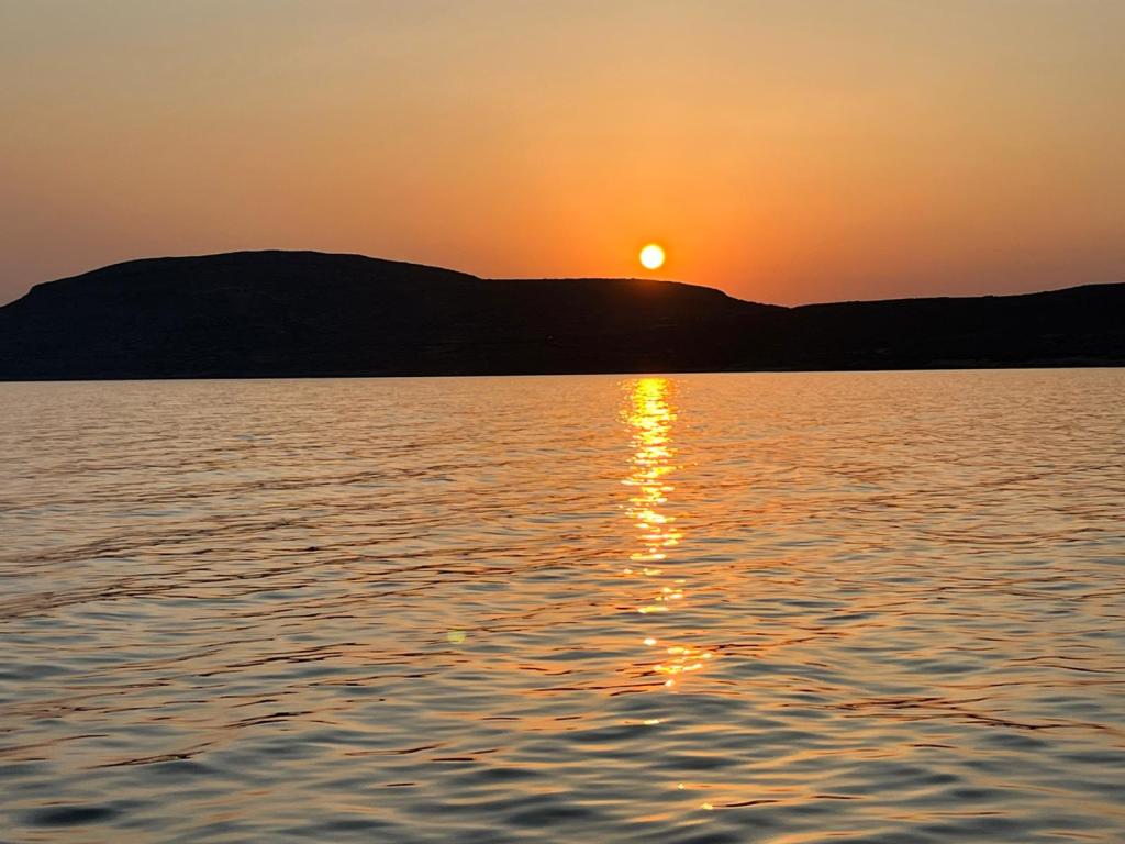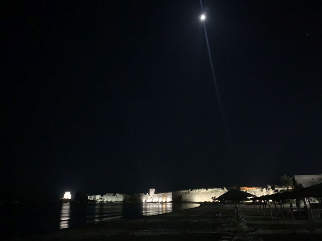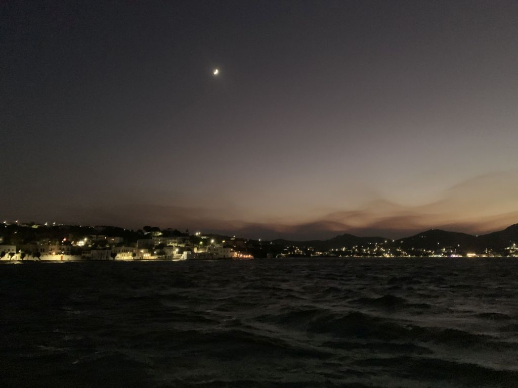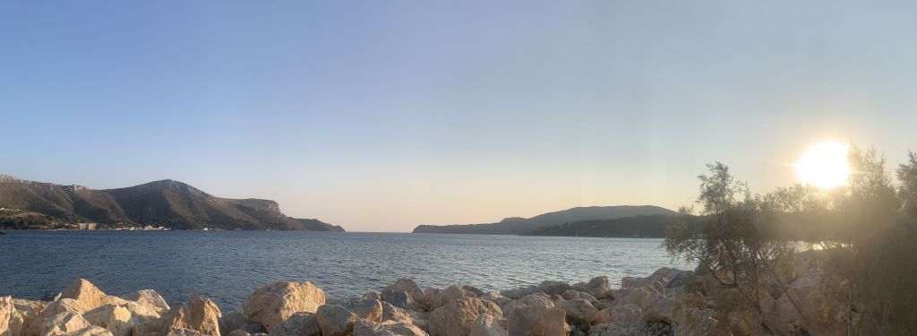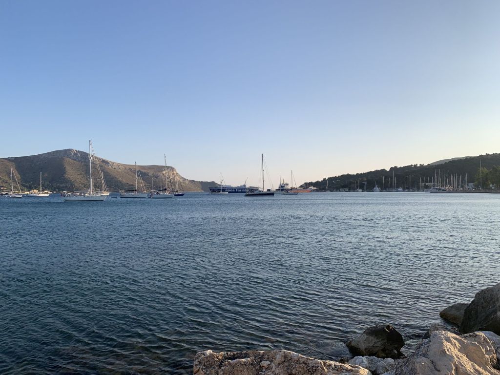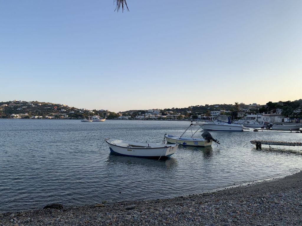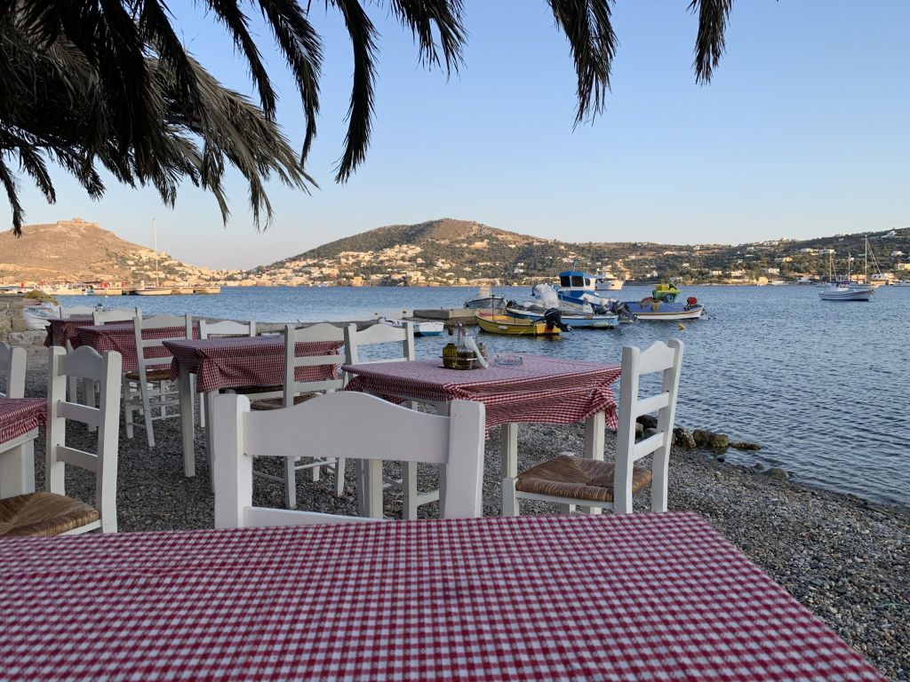 Wir nehmen Platz und genießen abermals den wunderbaren Ausblick auf die Bucht von Agia Marina und die perfekte Stimmung, die das Abendlicht zu dieser Stunde zaubert.