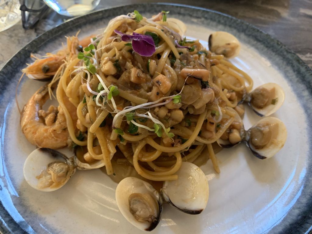 Zudem hatten wir einen Tisch im Innenraum reserviert, perfekt am heutigen Tag, denn so weht der Wind einem nicht die Flaschen vom Tisch.