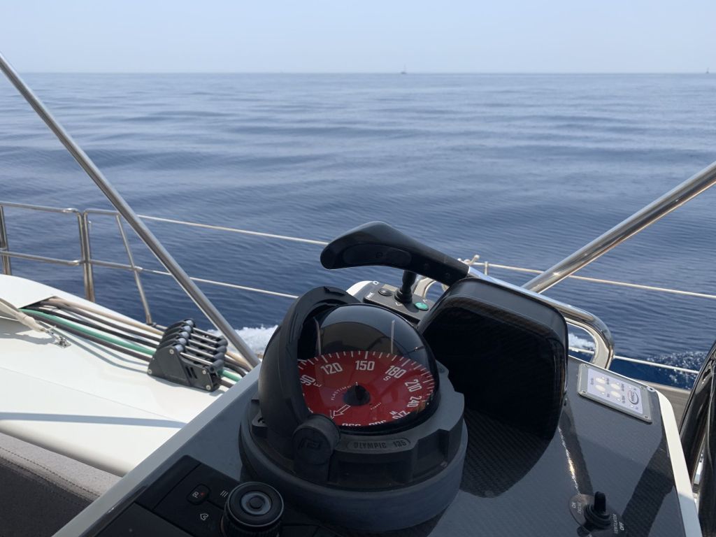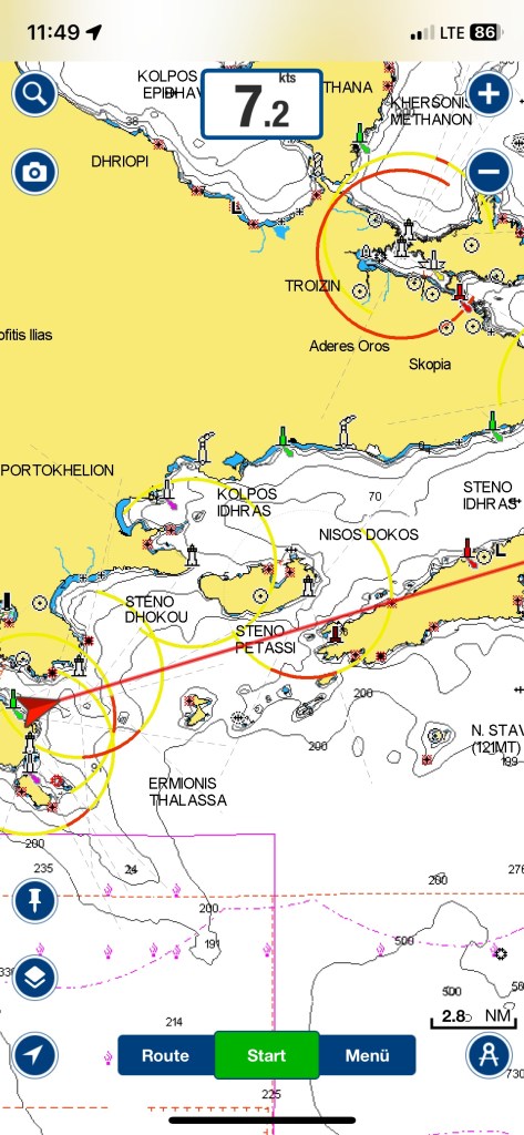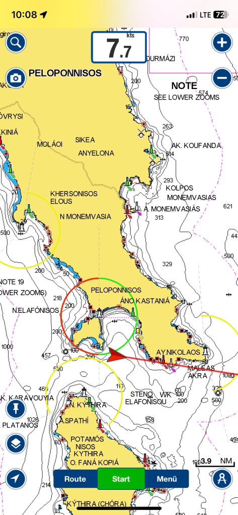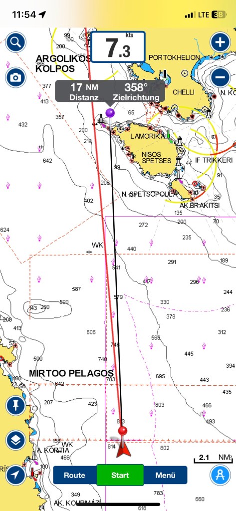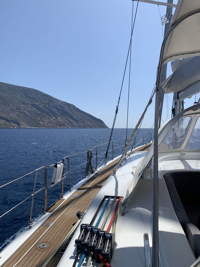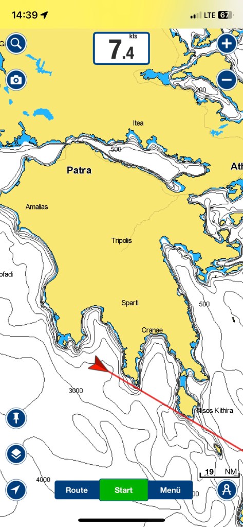 Noch ein paar Meilen, bis wir den Kanal verlassen haben werden, wir erhoffen uns ein Auffrischen des Windes, sobald das Kap von Kefalonia achteraus liegt.