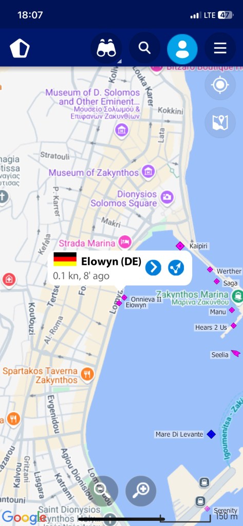 Am 01.06. werfen wir nach einem ersten Kaffee unsere Heckleinen los, gehen Anker auf und verlassen Fiskardo – unser nächstes Ziel ist Zakynthos Stadt auf der gleichnamigen Insel.