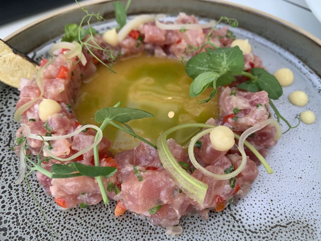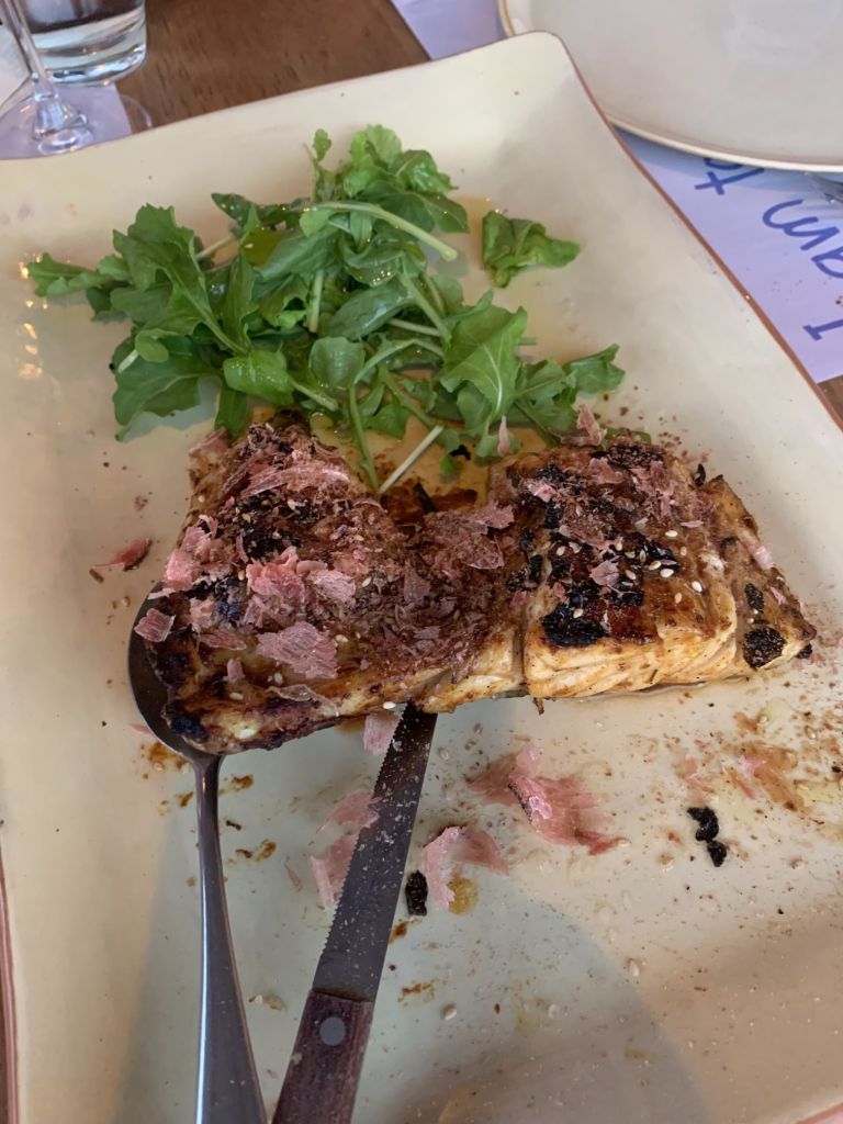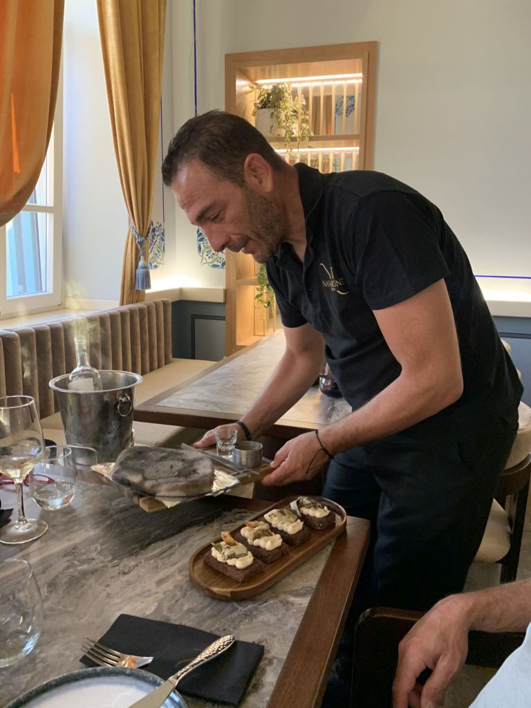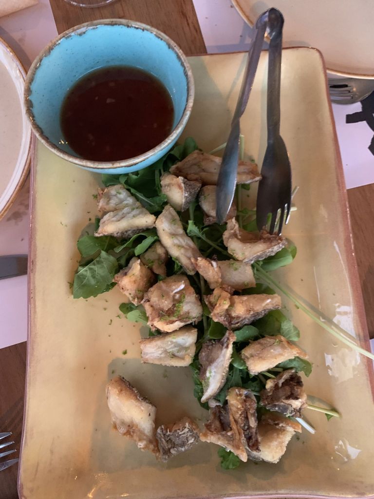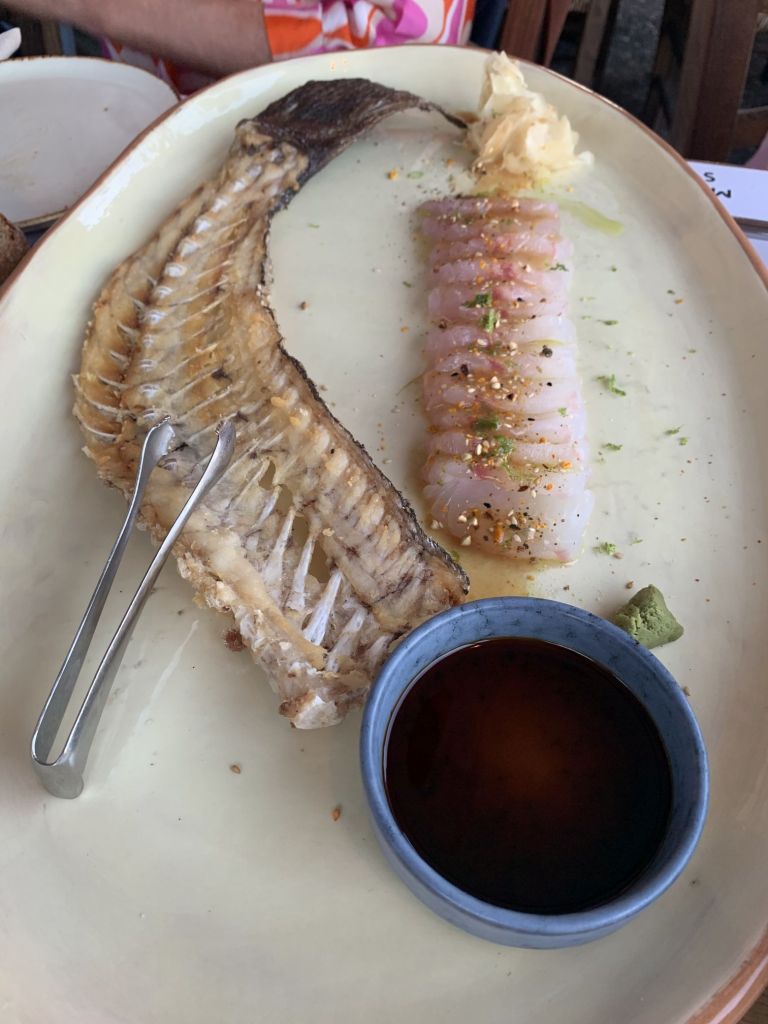 Dann eröffnet die Küche unser Dinner – wir hatten uns ja für die Variante „Nose to Tail“ entschieden, das bedeutet, dass aus dem gewählten Fisch, je nach Größe, mehrere Gänge zubereitet werden alles wird verwertet, von Kopf bis Schwanzflosse.