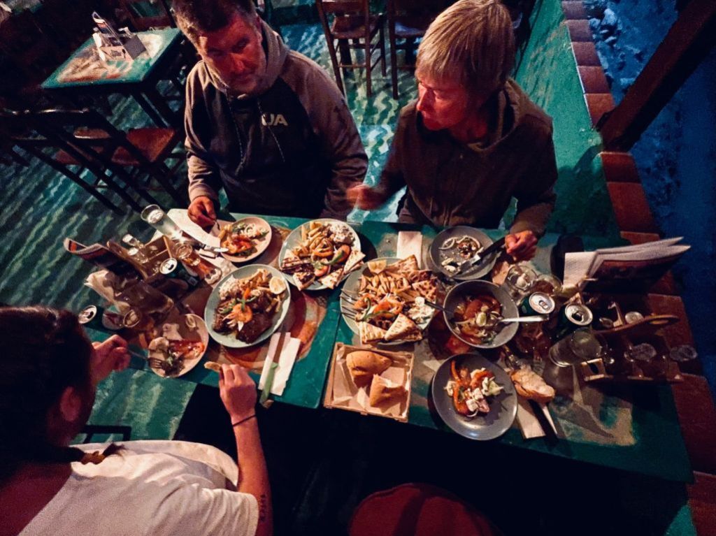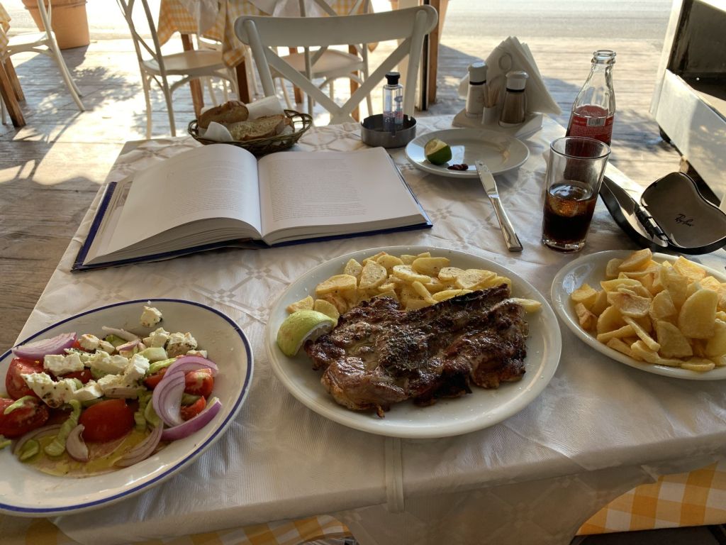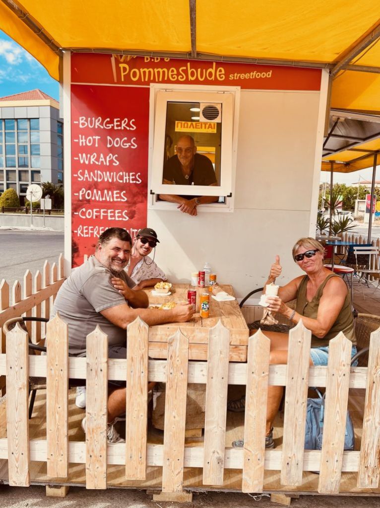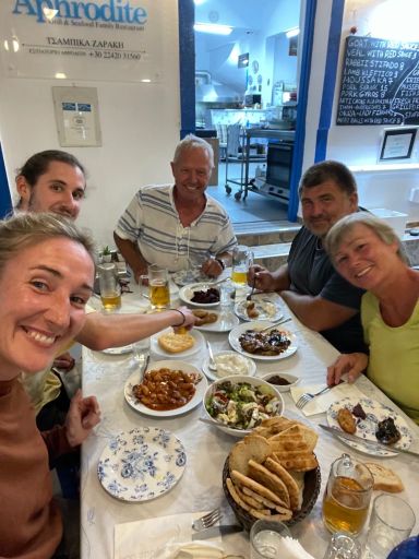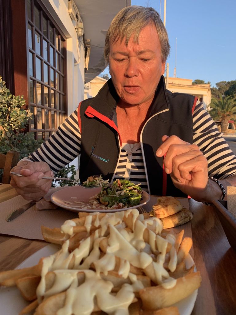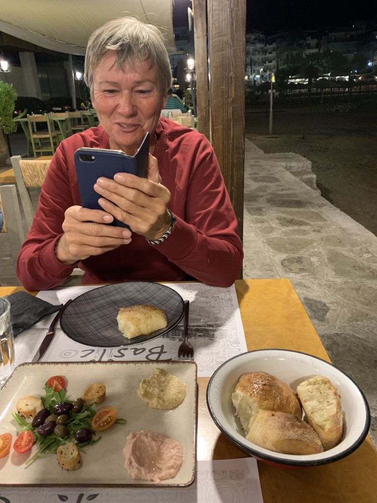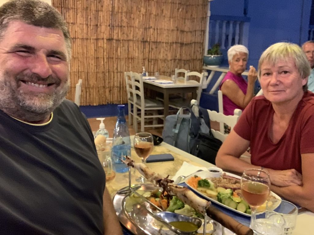 Sibylle kam wie geplant an, wir machten entspannt klar Schiff und gönnten uns am Abend ein Willkommensdinner bei unserem Freund Dimitris. Wir waren erledigt von der Anreise und wollten danach nur noch schlafen…