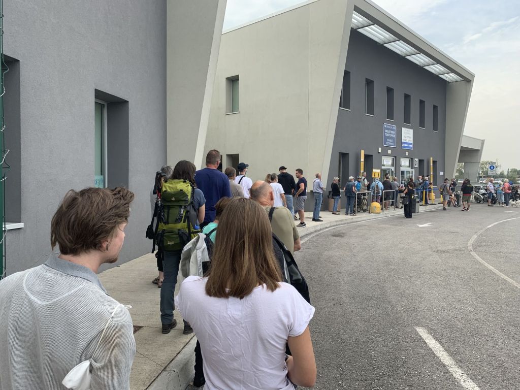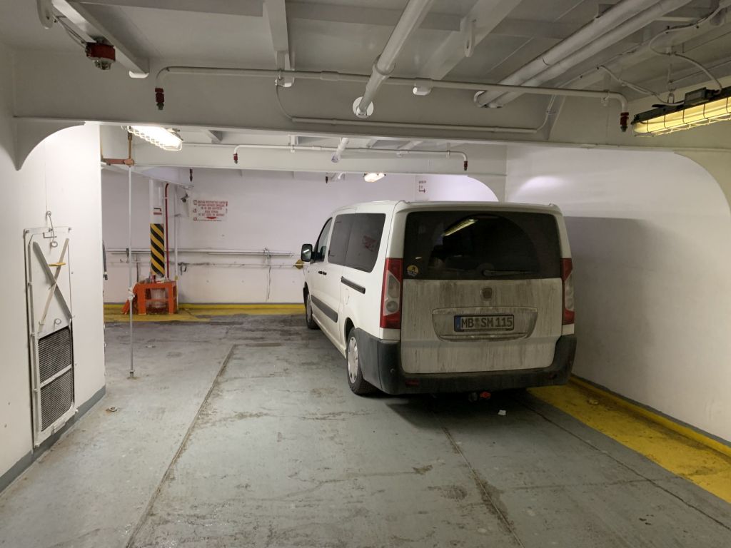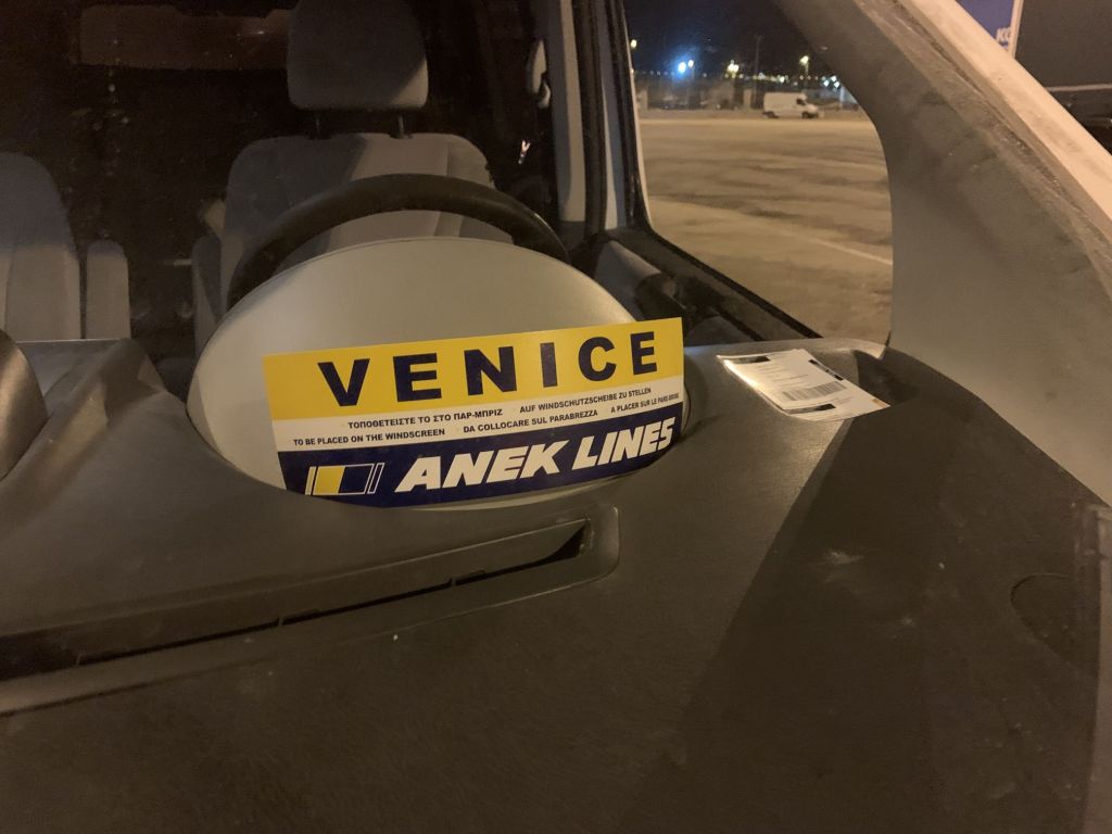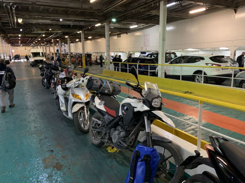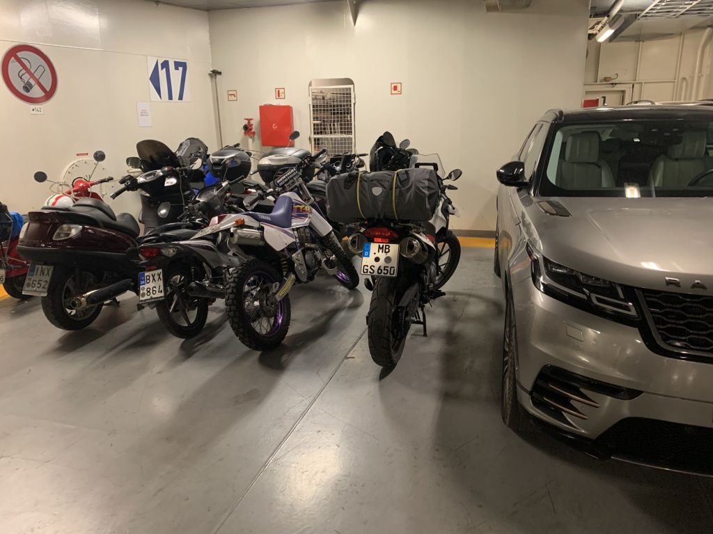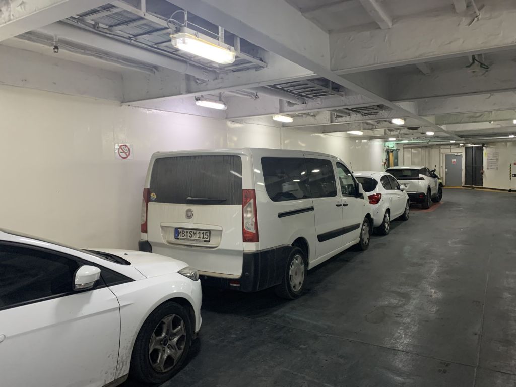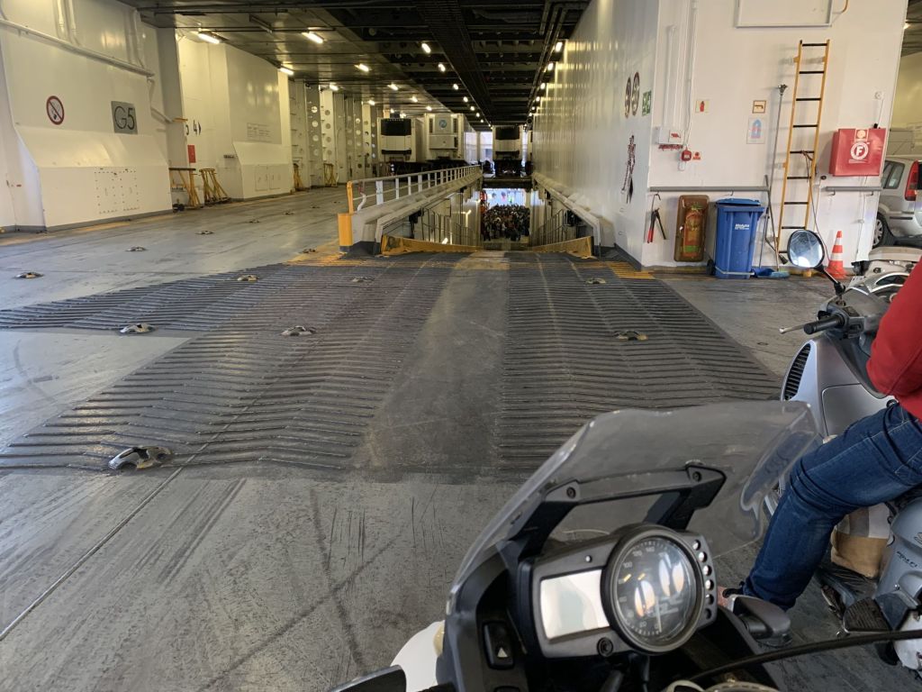 Durch unseren Zeitvorsprung waren wir auch der erste Bus / Lieferwagen in der Schlange und so recht früh und flott auf unserer Fähre eingecheckt. Gleiches Spiel wie immer – der Italiener bekommt im Heimatland eine Pole-Position…
