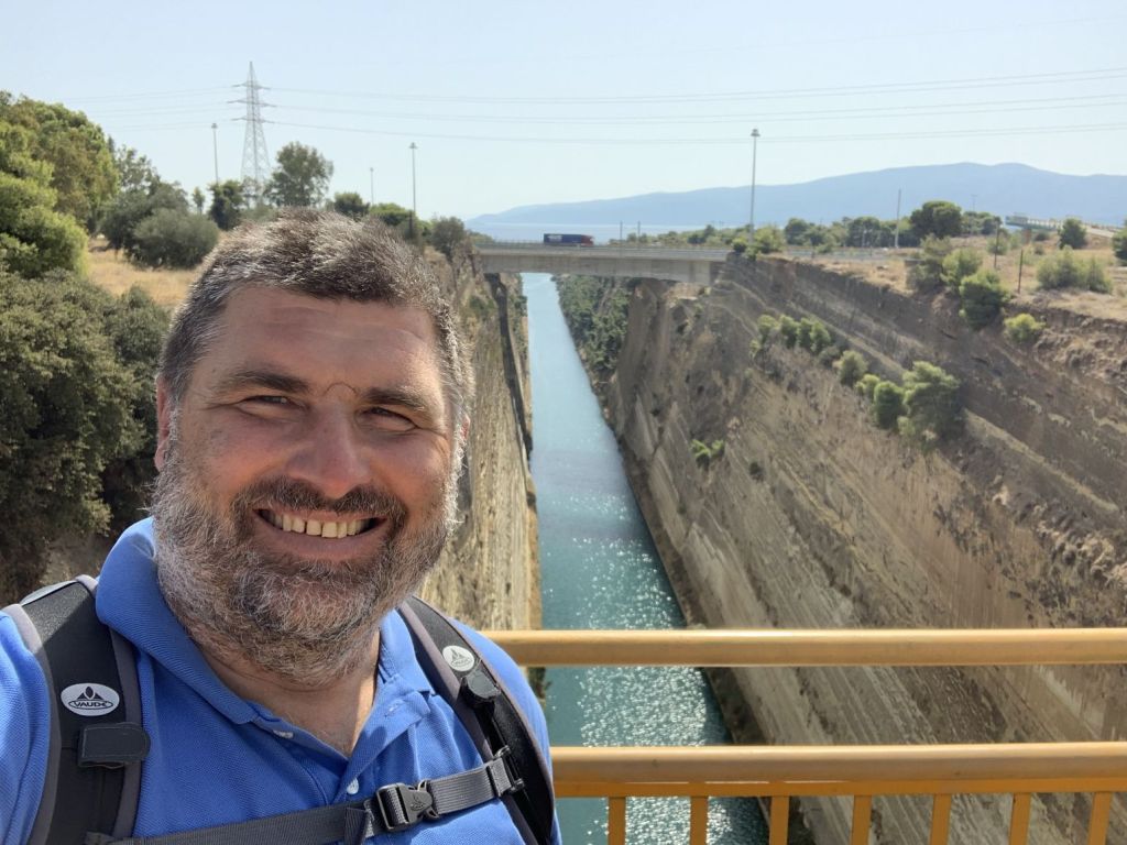 …oder beim Pflichtstopp an kulturell wertvollen Bauwerken, wie dem weltberühmten Kanal von Korinth. Hier bin ich 2011 mit der alten NESSAJA durchgefahren und jetzt habe ich den Kanal mit dem Motorrad passiert – ich fühlte mich griechisch 😉 …