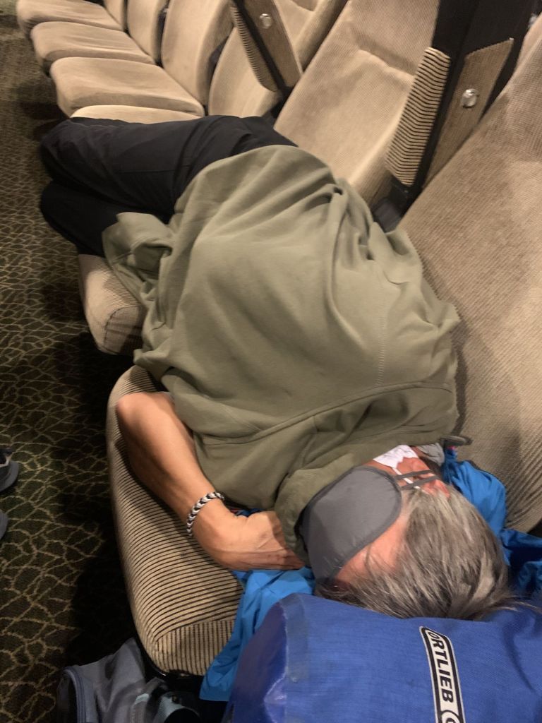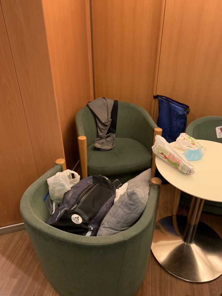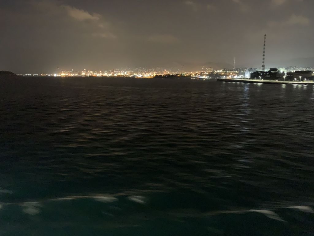 Ich hatte wieder Deckspassage, aber wiederum Glück bei der Platzwahl. Ich fand einen freien Eckplatz und konnte mir ein Lager für die neunstündige Überfahrt bauen.