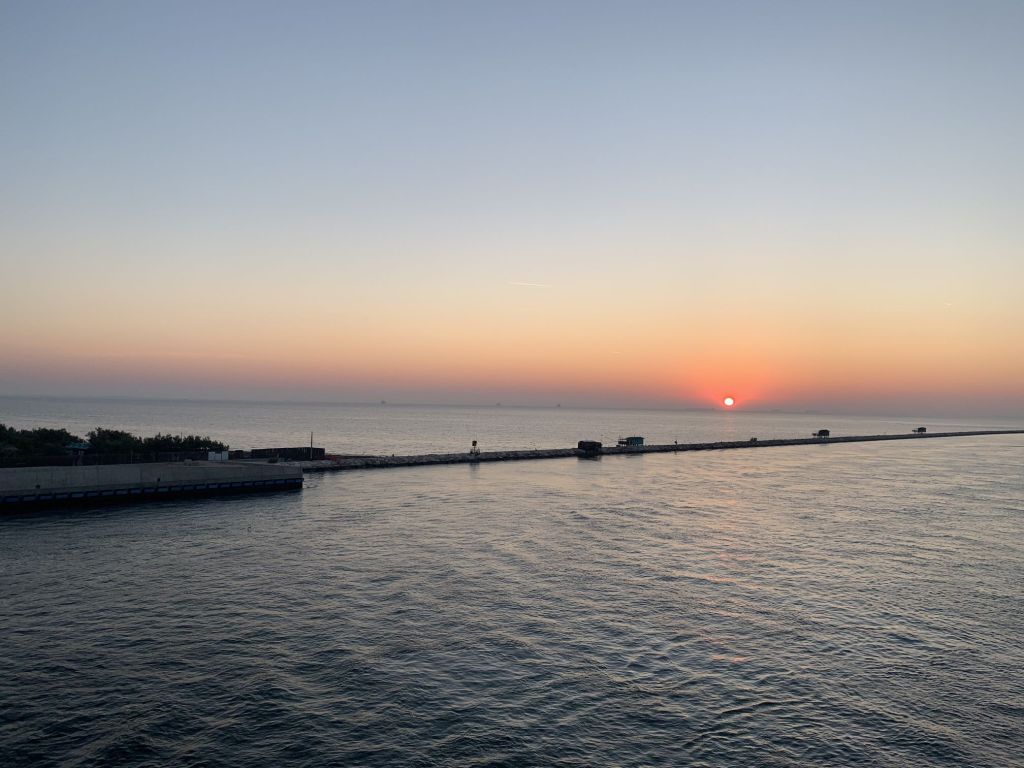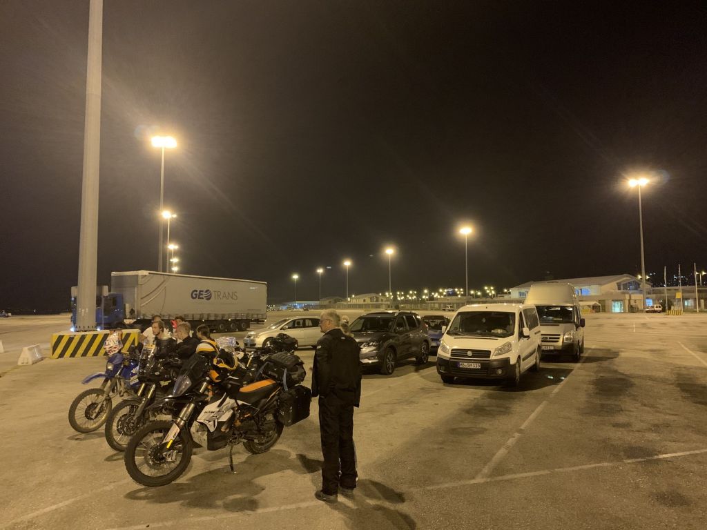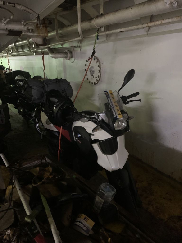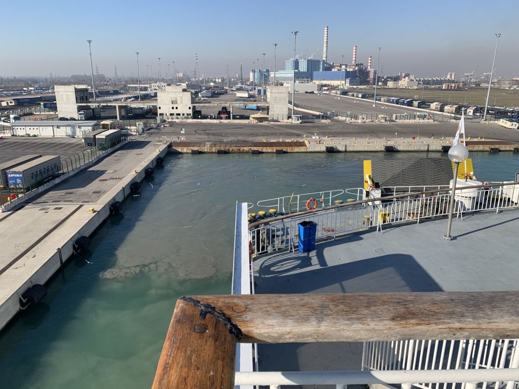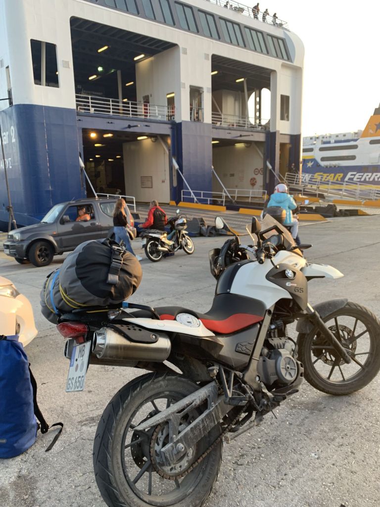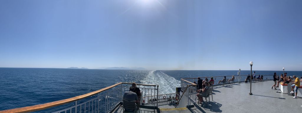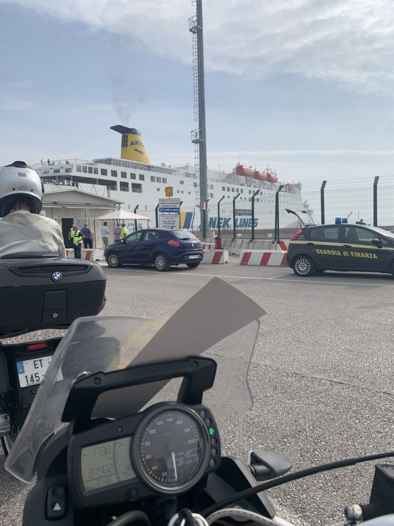 Es war so weit, mit nur einer halben Stunde Verspätung legt der Riese mit vollem Bauch (nicht ich – die Fähre) Richtung Griechenland ab. Eine Nacht an Bord steht am Plan, dann noch ein ganzer Tag – und wenn alles klappt, sind wir morgen Abend gegen 22.00 Uhr in Patras.
