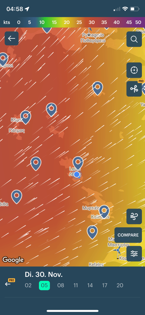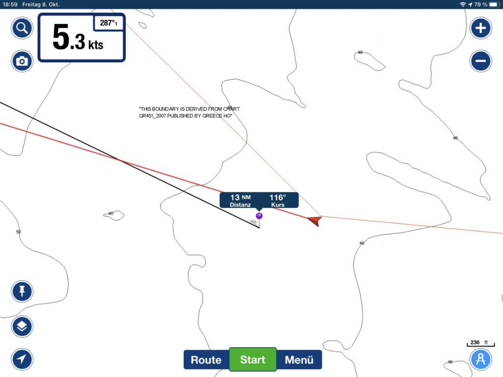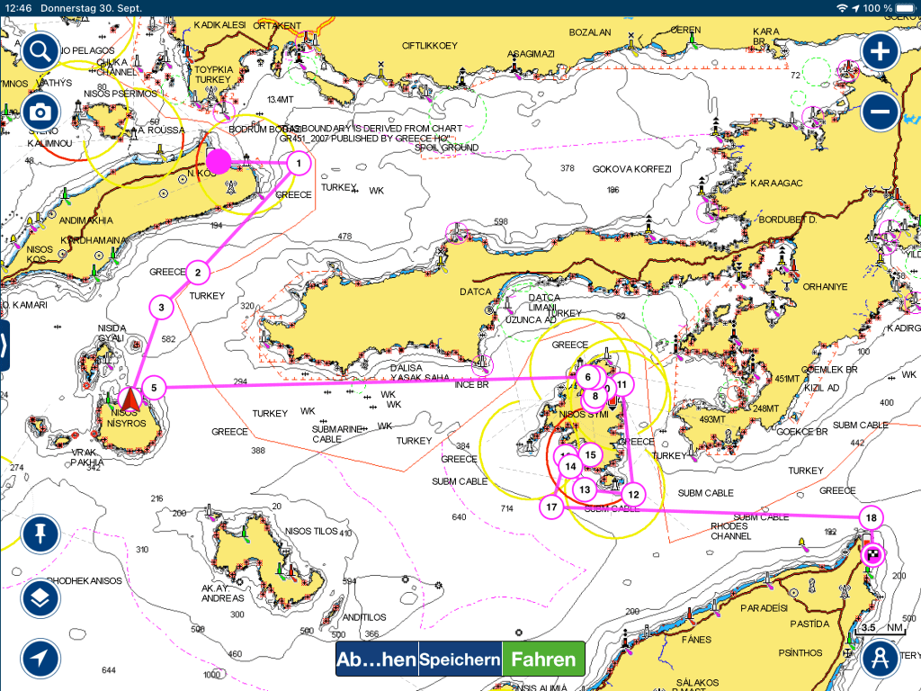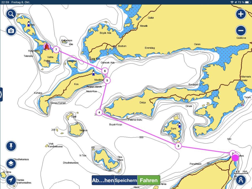 Ob ein Abstecher nach Tilos möglich und gewünscht ist wollten wir unterwegs entscheiden, heute wissen wir – das wird nix mehr! Zur Wettersituation, die uns natürlich bekannt war, später noch ein paar Worte mehr. Es war Zeit abzulegen, wir verließen die Kos Marina in bester Laune und setzten umgehend die Segel.