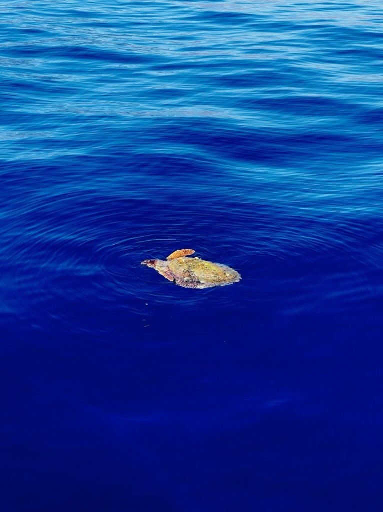 DELFINE!!! Franzi schien etwas gesehen zu haben – nein, doch nicht! Aber was ist das dann? Des Rätsels Lösung, eine Schildkröte welche sich in der Sonne während einer Flaute gesonnt hat und sich auch durch unser langsames und vorsichtiges Herangleiten nicht aus der Ruhe bringen ließ.