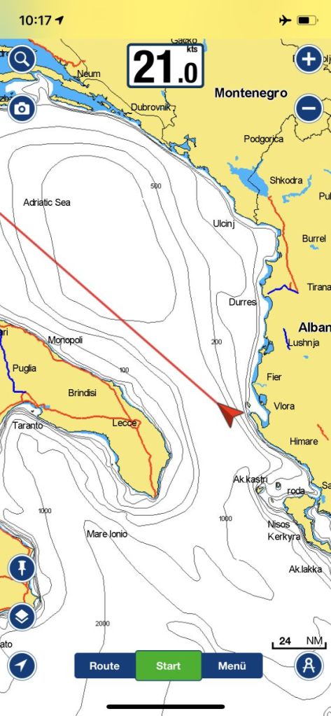Plan, klappt, hätte – Ihr merkt schon, da lag was in der Luft! Wir hatten soeben Land in Sicht, die Küstenlinie von Albanien querab, da stellten wir mit einigem Zeitverzug fest – hier tut sich nix mehr! Das Schiff stand! Ein Blick auf die Handyapp genügte, Speed 0,0 kts, das bedeutet nix Gutes…