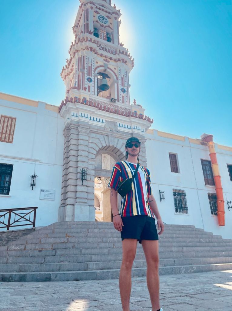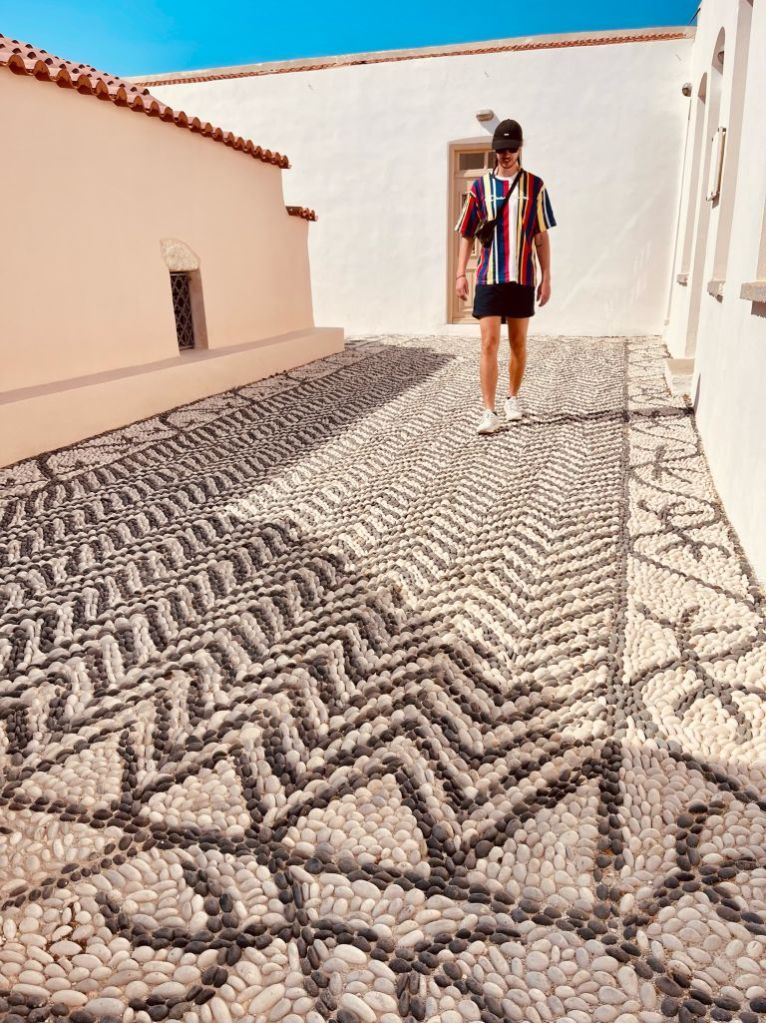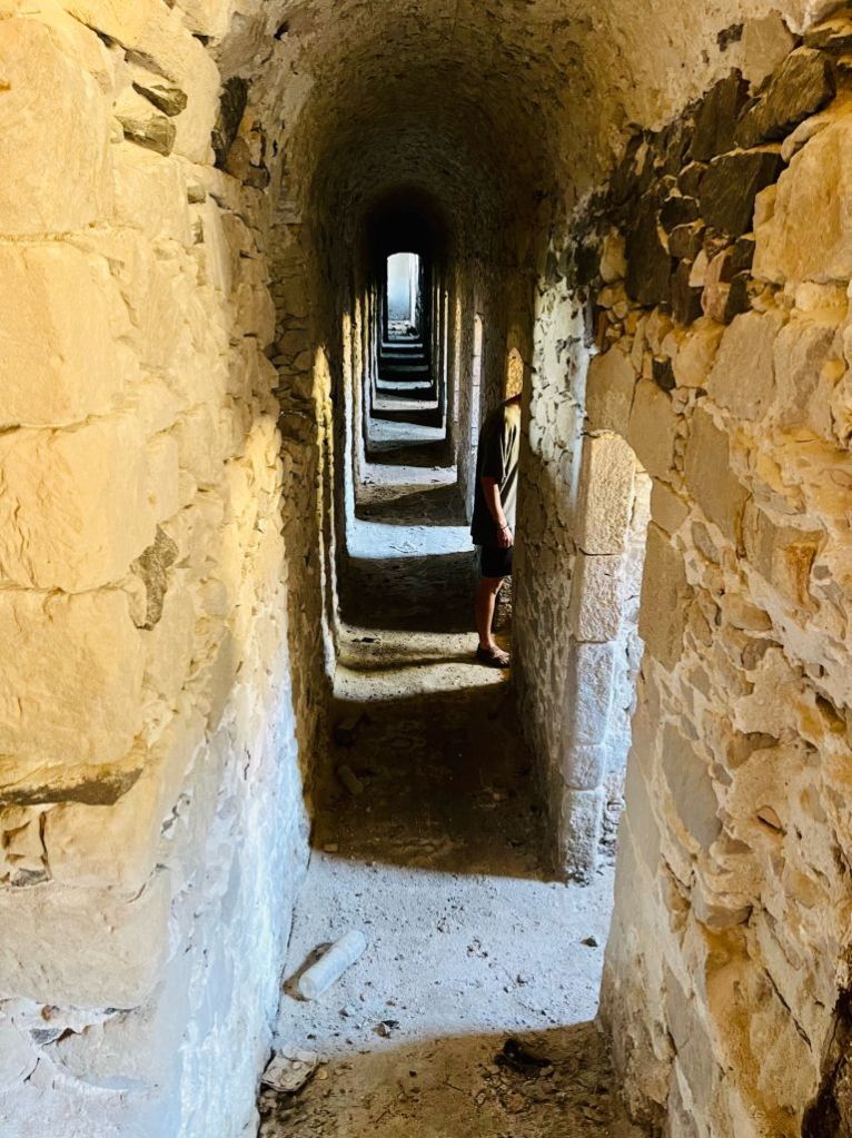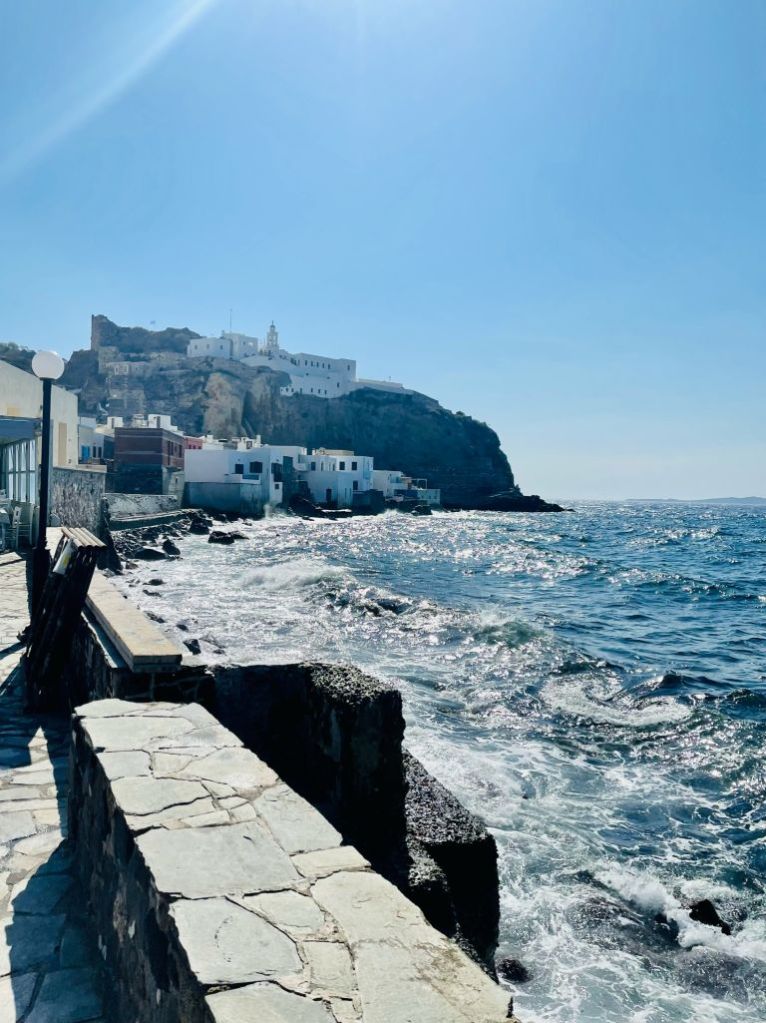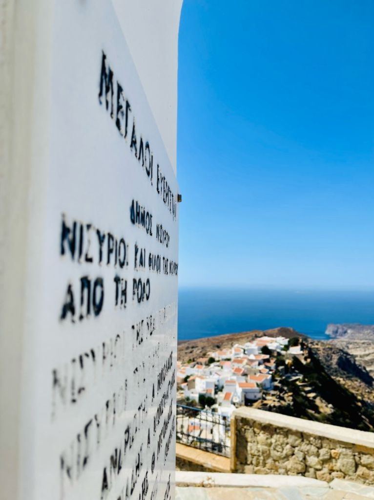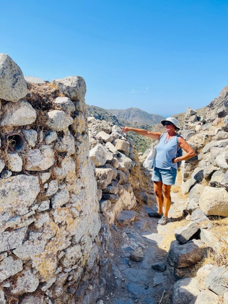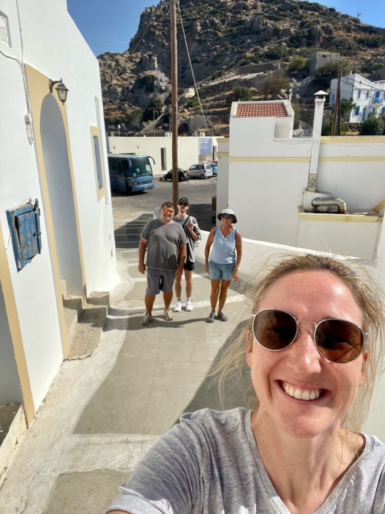 Emborio selbst ist ein wenig verfallener, besticht aber durch seine Burgruine und ein wunderschönes Lokal, das „Balcony“. Dort haben wir etwas getrunken, aber erst NACHDEM wir die Burg erklommen hatten – unter der Anleitung unserer belesenen Fremdenführerin.