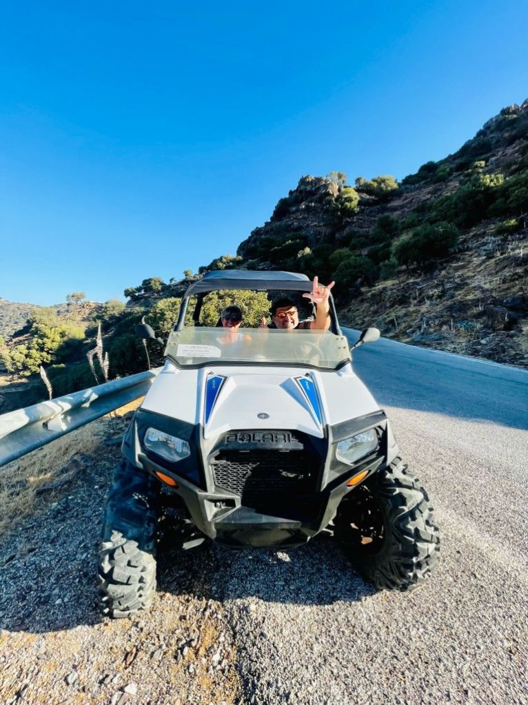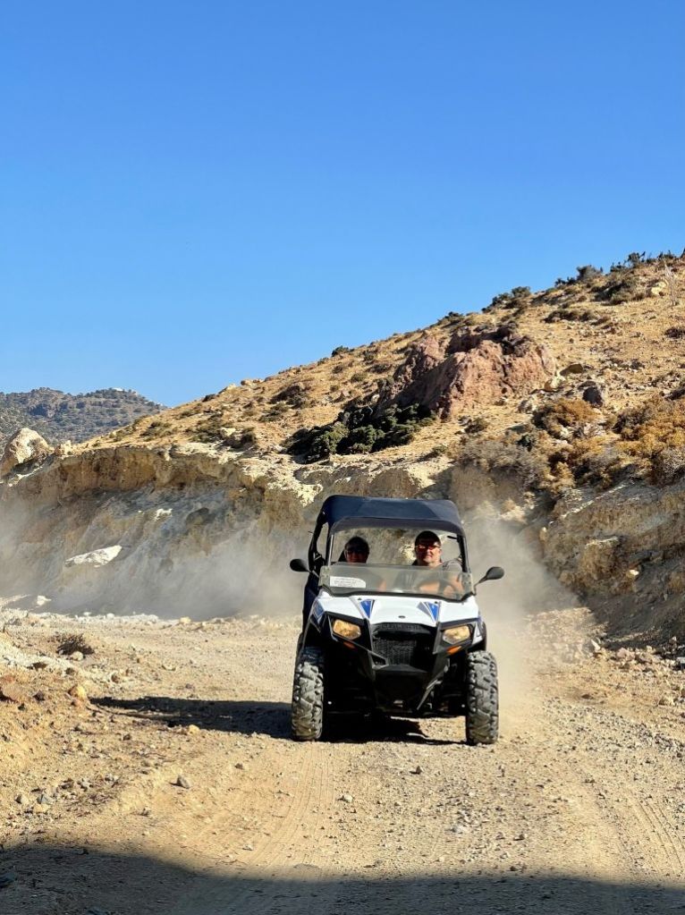 Yeah, ab ins ATV und über die Schotter- und Sandpisten der Insel zu den kleinen Städtchen am Kraterrand, zuerst nach Nikia…
