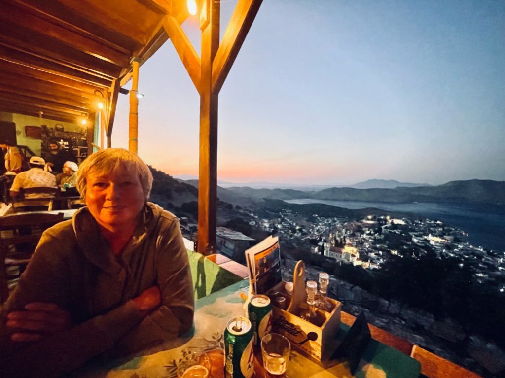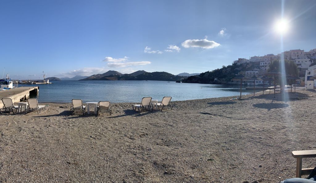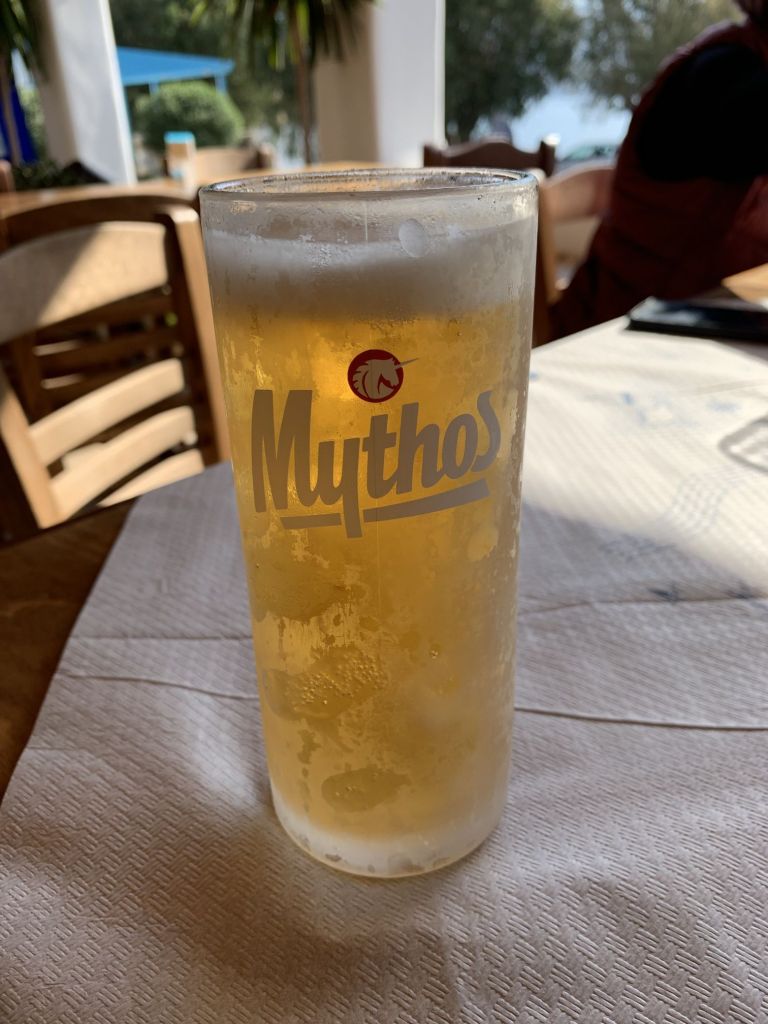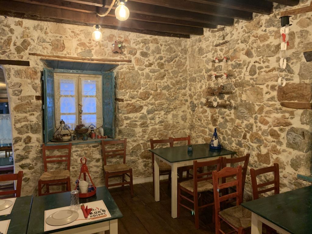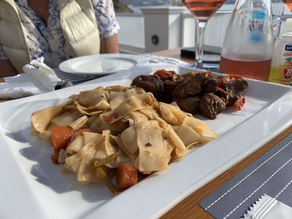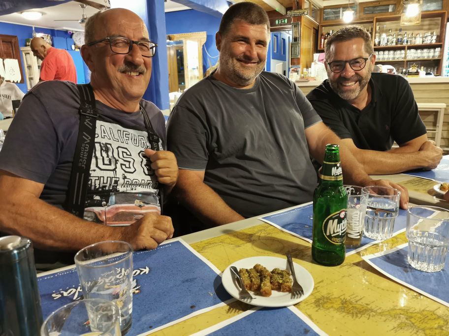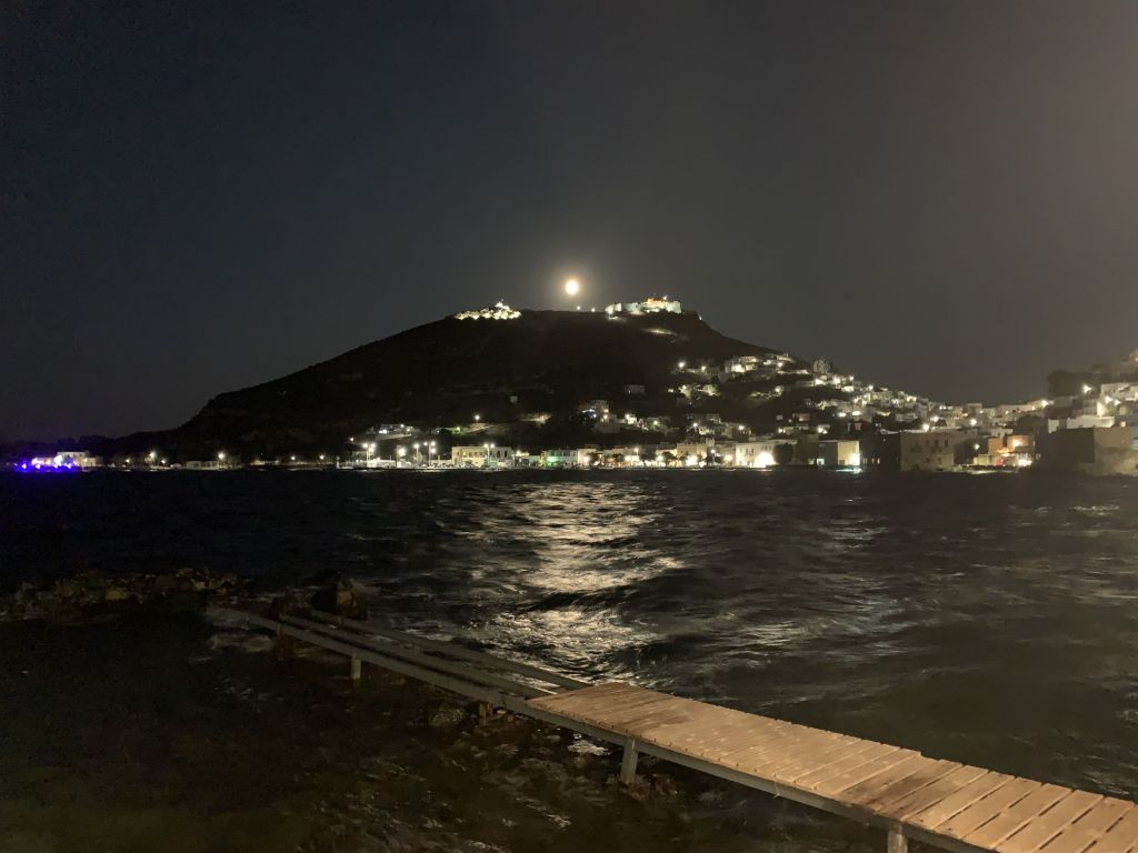 Unsere Idee war in Mandraki zu essen, hier gibt es ein Lokal welches in TripAdvisor mit 4,9 bewertet ist und direkt am Fuß des Klosters liegt. Da dies aber dauerhaft geschlossen schien, gingen wir kurzerhand der Empfehlung von Segelfreunden nach und reservierten im „Aphrodite“ in Paloi. Diese Taverne scheint die beste am Platze zu sein, wir können das nicht vergleichen aber im Ergebnis durchaus bestätigen. Das „Aphrodite“ ist sehr empfehlenswert, man wird freundlich empfangen und alles was wir gegessen und probiert haben war super. Reservierung ist empfehlenswert! Wir haben hier Johannes aus der Nähe von München kennen gelernt, er segelt alleine und wir konnten ihm ein wenig Kurzweil bescheren.