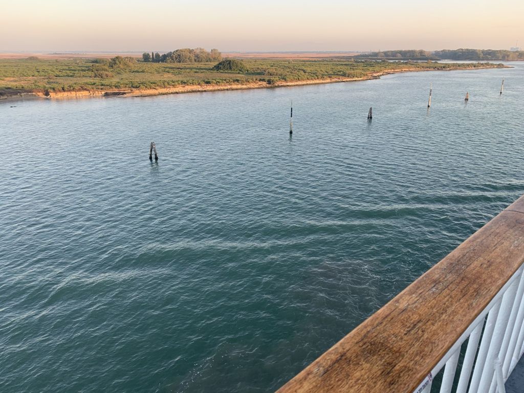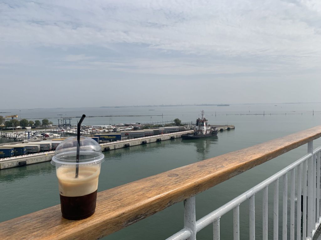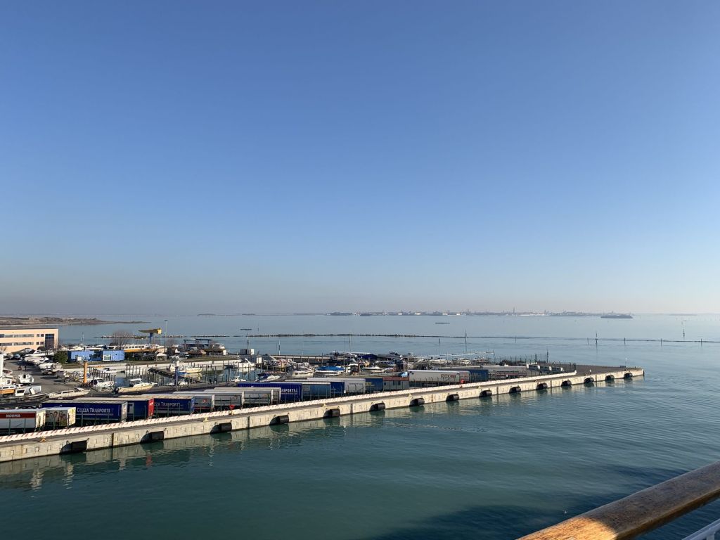 Die Fahrt verlief unspektakulär, ohne Pause. Wir erreichten Fusina, den Fährhafen von Venedig, sehr zeitig und konnten als Erste am Schalter unsere Tickets bekommen, danach hatten wir Zeit frühstücken zu gehen.