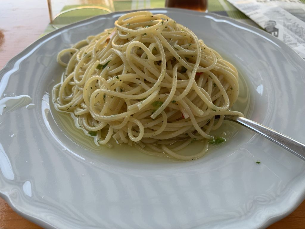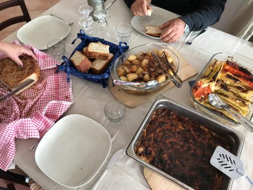Natürlich gab es einen Grund warum es „nur“ Pommes als Mittagstisch gab, wir hatten Italien durchquert und dabei – selbstverständlich – allerlei Leckereien eingekauft. Diese soll es am Abend des ersten Tages und am Mittag des zweiten Reisetages geben. Soweit der Plan, Umsetzung stande pede!