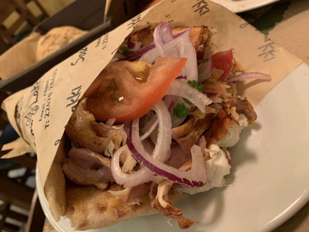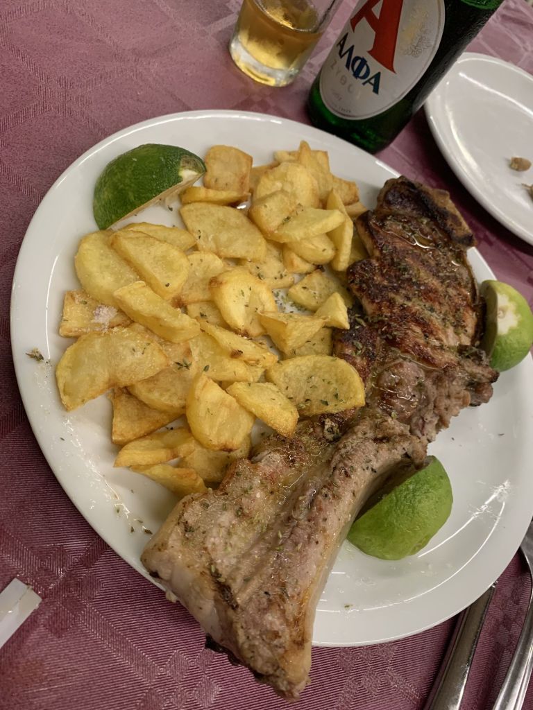 Das wirklich Gute aber war, dass ich mir eine Lage ausgesucht hatte welche man aus „normalem“ Blickwinkel eher als suboptimal bezeichnen würde. Direkt an einer Einfallsstraße nach Patras, unweit des Autobahnzubringers, in der ersten Etage eines Autohauses – aber eben verkehrsgünstig zum Port (5 Minuten) und fußläufig zu meinem „Stammlokal“ in dem mich die Bedienung und der Chef inzwischen kennen. Es wurde wieder gefragt ob „Meat“ meinen Vorstellungen entspräche, abermals wurde ich nicht enttäuscht…