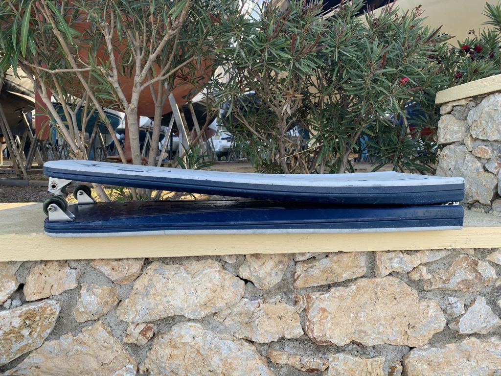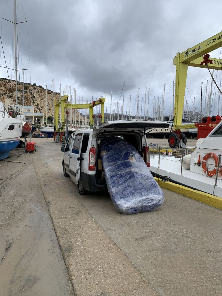 In Athen / Glyfada angekommen, musste das Dinghy noch in den eigentlich vollen Bus. Ich wusste das ja vorher und habe den vermeintlich noch zu belegenden Platz freigehalten – obenauf eben.