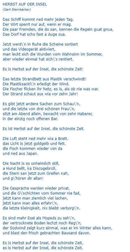 „Da ist die Frau an meiner Seite, die diese Arche mit mir lenkt Die mir ihre schöne Seele und ihre Klugheit schenkt Die ich liebe und an der ich jedes kleinste Wort und jede Regung mag, die Freundin, die Komplizin, die mit mir zusammenhält Wie Pech und Schwefel, zwei gegen die ganze Welt Mit der ich jeden Lebensturm durchqueren kann und jeden ganz normalen Tag… Du hast alles, was du wolltest! Was um alles in der Welt Wieviel unwichtiges Zeug dir oft den Blick darauf verstellt! „What a lucky man you are!“
