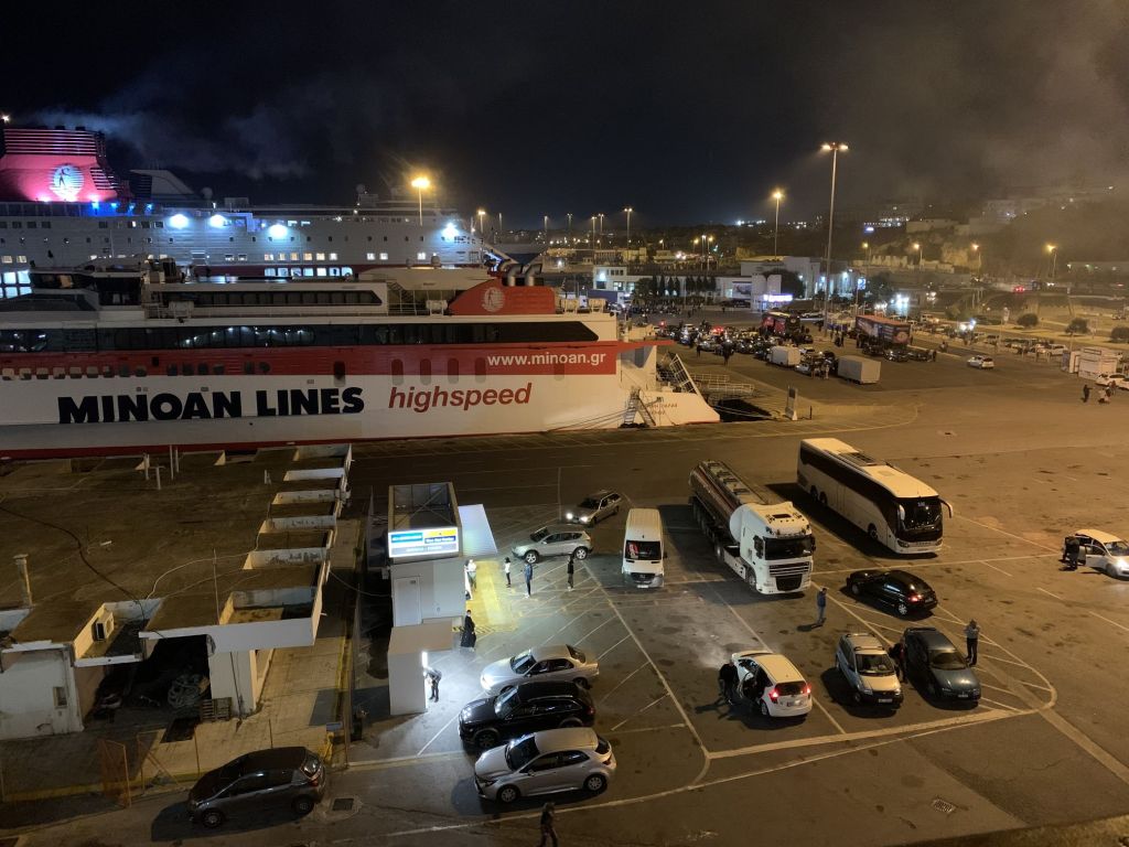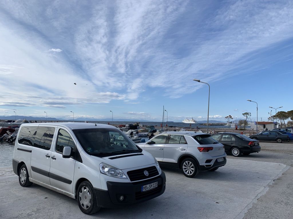 Just in time haben wir unseren bewährten und voll bepackten Scudo wieder gestartet und sind mit ihm zurück nach Piräus gefahren, wo wir bereits für die 18.00 Uhr Fähre Richtung Dodekanes eingecheckt waren. Zielstrebig fuhren wir zu Gate E1 und stellten uns in die Reihe, besser – wir haben sie eröffnet!