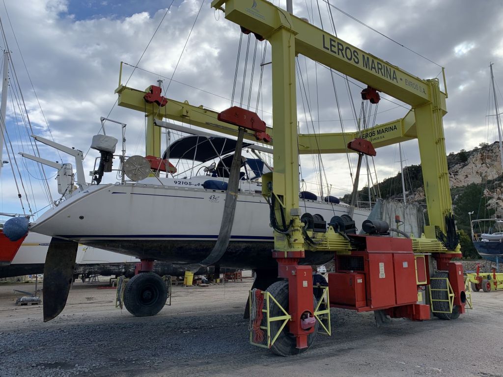 Im Kran – ab jetzt geht´s aufwärts……noch das Unterwasserschiff reinigen – sieht gut aus nach drei Jahren!Umladen auf den Wagen – auf dem Weg zum Standplatz am TrockenenLiegeplatz und Arbeitsplatz für vier Monate – aufgepallt in der Marina