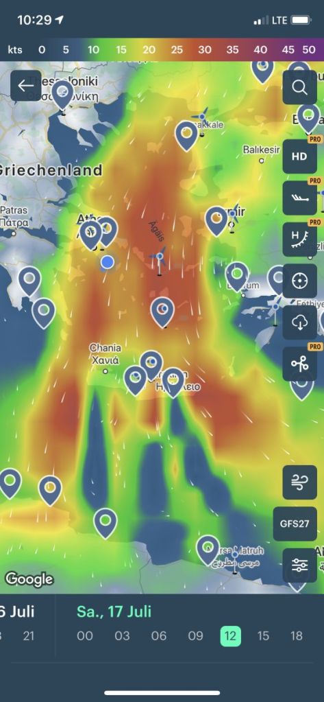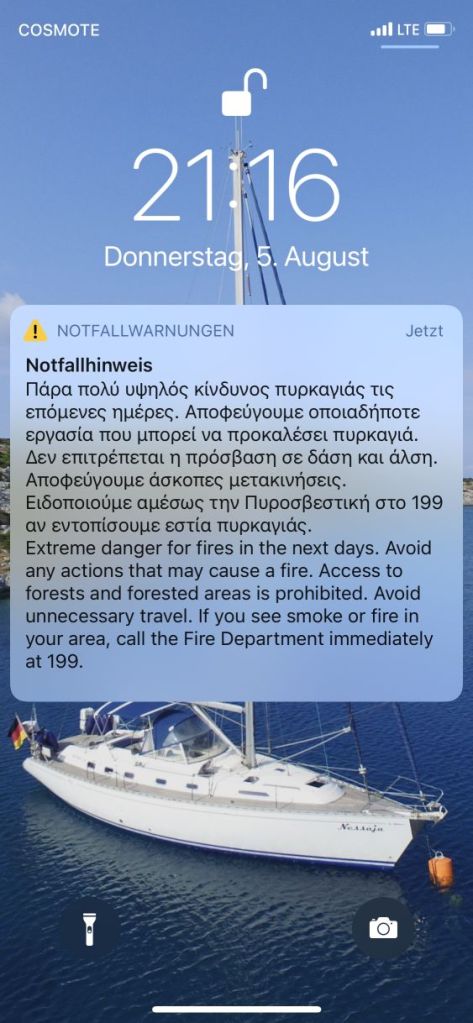 Was für uns auf diese Art und Weise gut zu handhaben war, wurde für die Natur in Griechenland mehr und mehr problematisch. Alle Wiesen und Felder, das Gebüsch und Sträucher – alles war restlos ausgetrocknet und aufgeheizt. Es fehlte nur noch ein „Zündfunke“ und es würde ein Inferno geben – es wurde über alle verfügbaren Medien und Kanäle gewarnt.