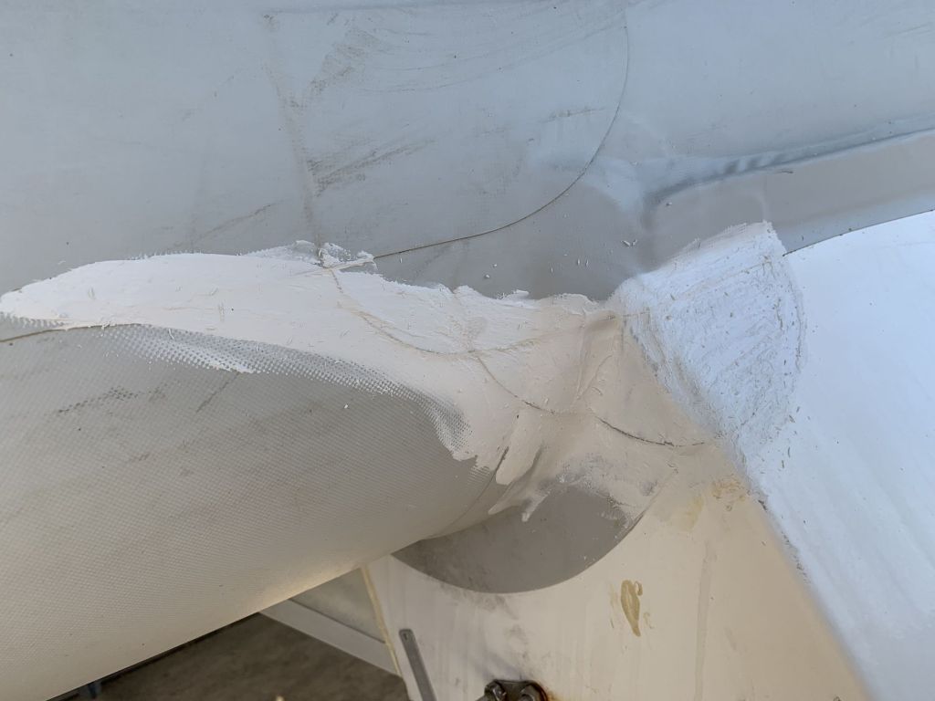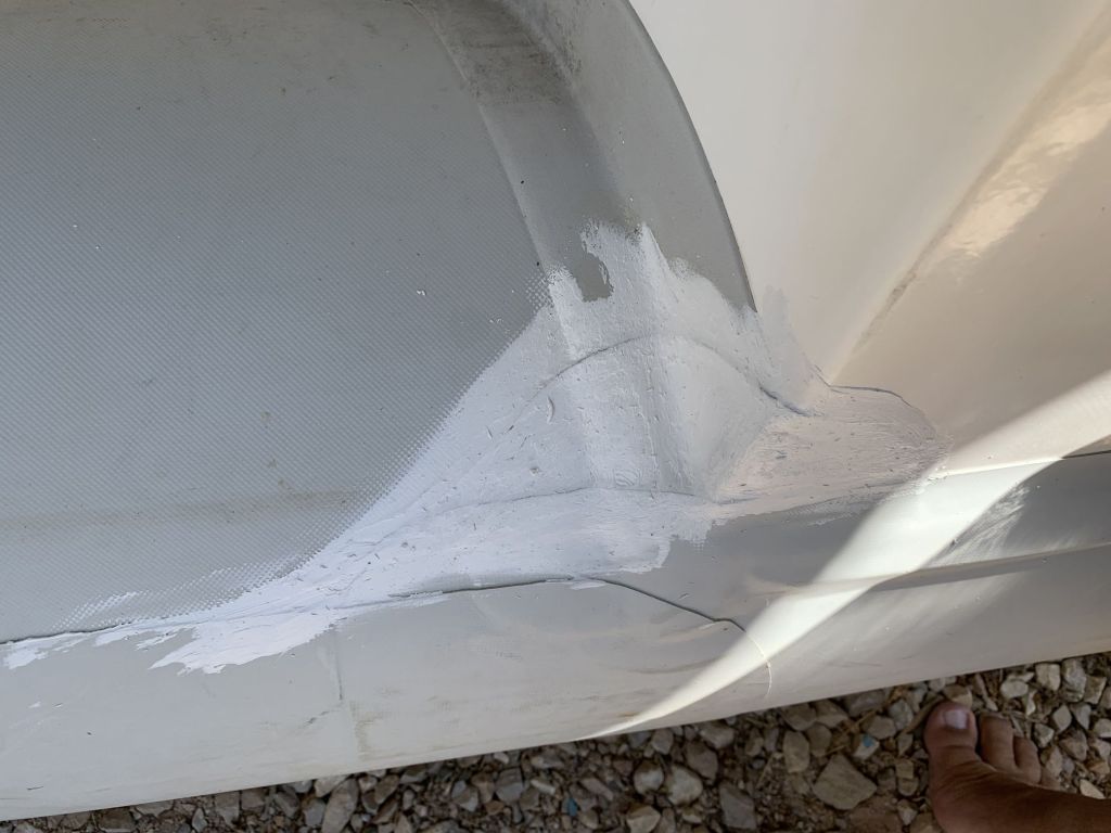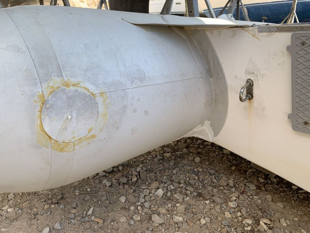 Zugegeben, schön ist anders – aber zuerst mit Zwei-Komponentenkleber geklebt, dann die Klebekanten mit Klebe-/Dichtmasse verschmiert, quasi die Hyaluronsäure der Schlauchboothaut – das sollte bis November halten – dann wird das Mercury Dinghi ersetzt.