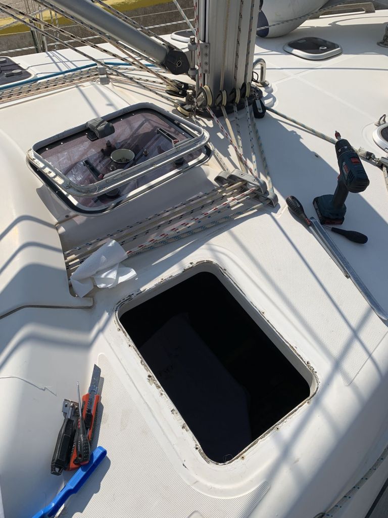 Dermaßen ermutigt nehme ich mir den letzten Punkt vor die Brust – wieder was mit Schmieren und Kleben – nach der Backbord-Dachluke ist nun die Steuerbordseite undicht und schreit nach gutem SIKA.