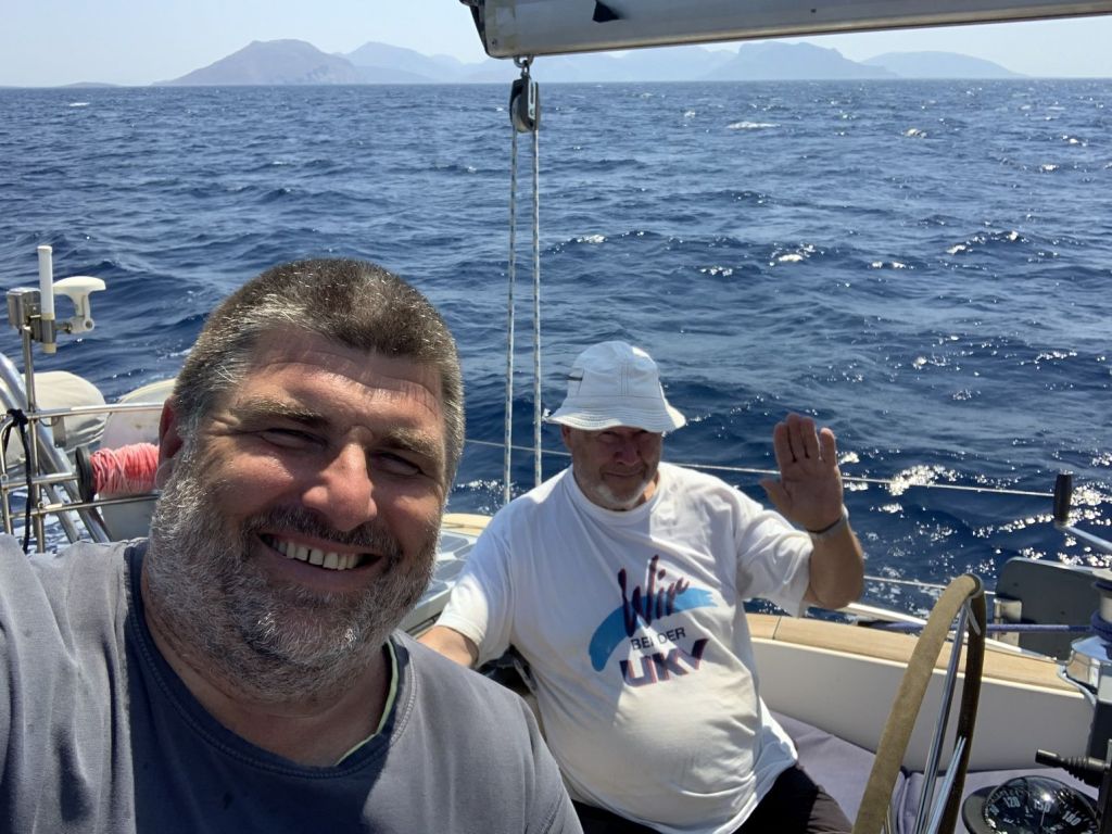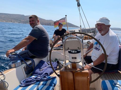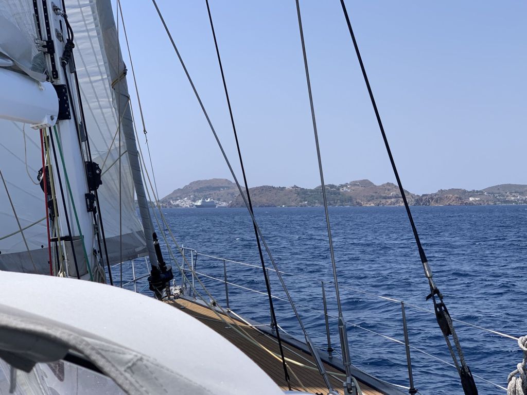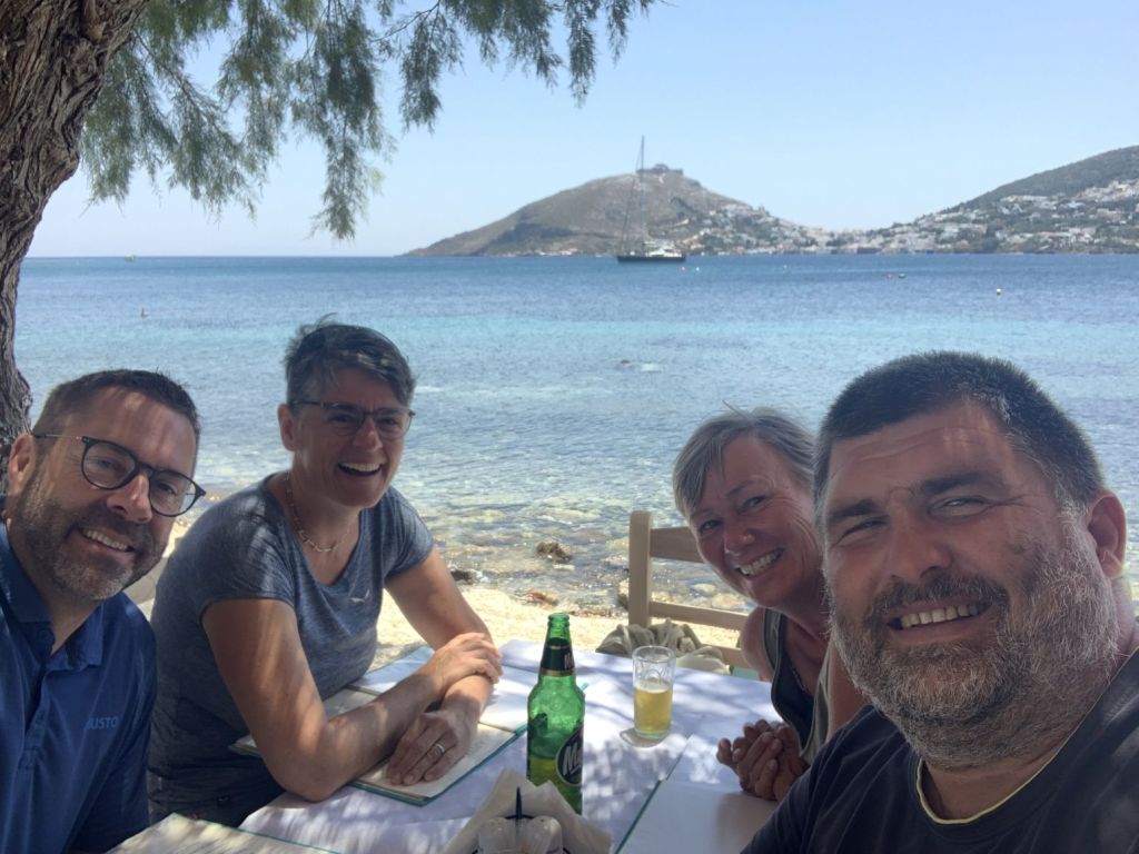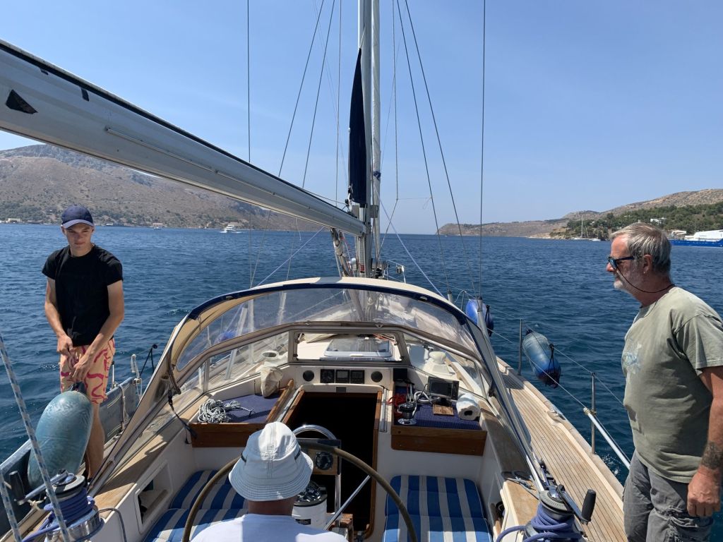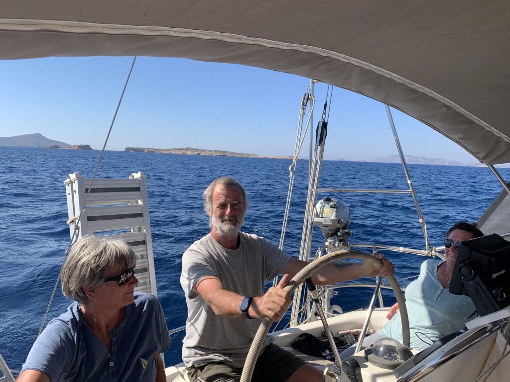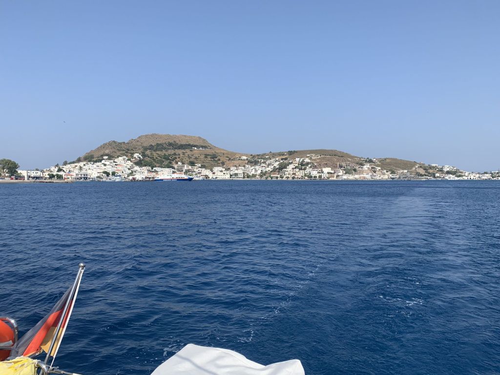 Wenn Ihr den Beitrag des letzten Monats gelesen habt wisst Ihr, dass Hans-Peter und ich die Gelegenheit hatten, mit Werner zusammen eine Testrunde zu segeln. Dies scheint Hans-Peter gefallen zu haben und er hat Sibylle und mich eingeladen, auch mit Petra und ihm einen Schlag zu segeln. Der Plan sah vor, die gleiche Wegstrecke zurückzulegen wie ein paar Wochen vorher mit Werner. Also Lakki, nordwärts, zwischen Leros und Archangelos durch, wieder südwärts bis in die Bucht von Alinda. Dort wollten wir bei Dimitris´ „To Steki“ essen, bevor wir mit dem Taxi zurückfahren.