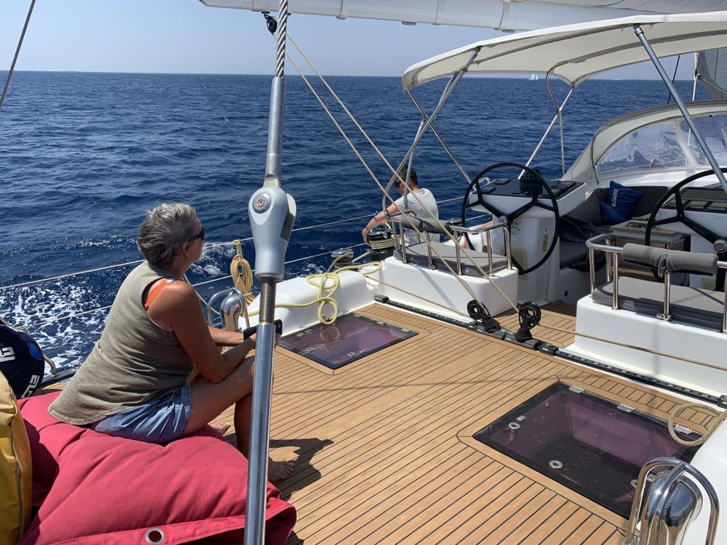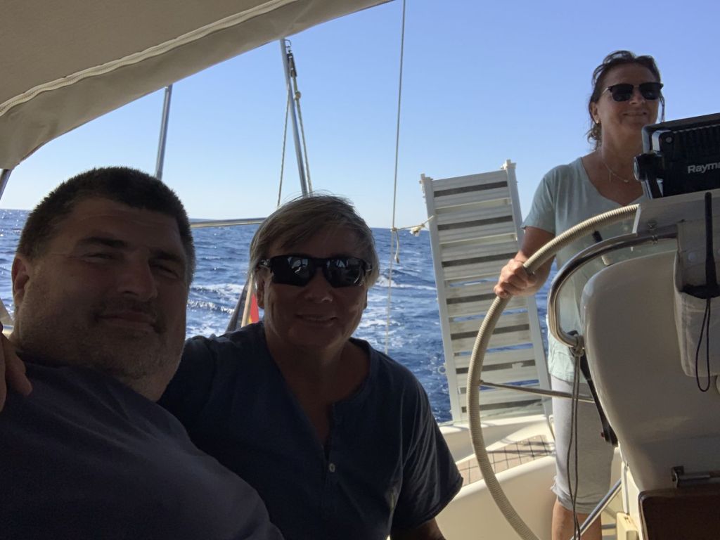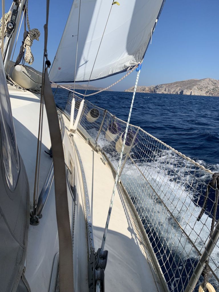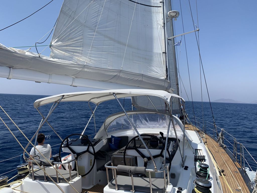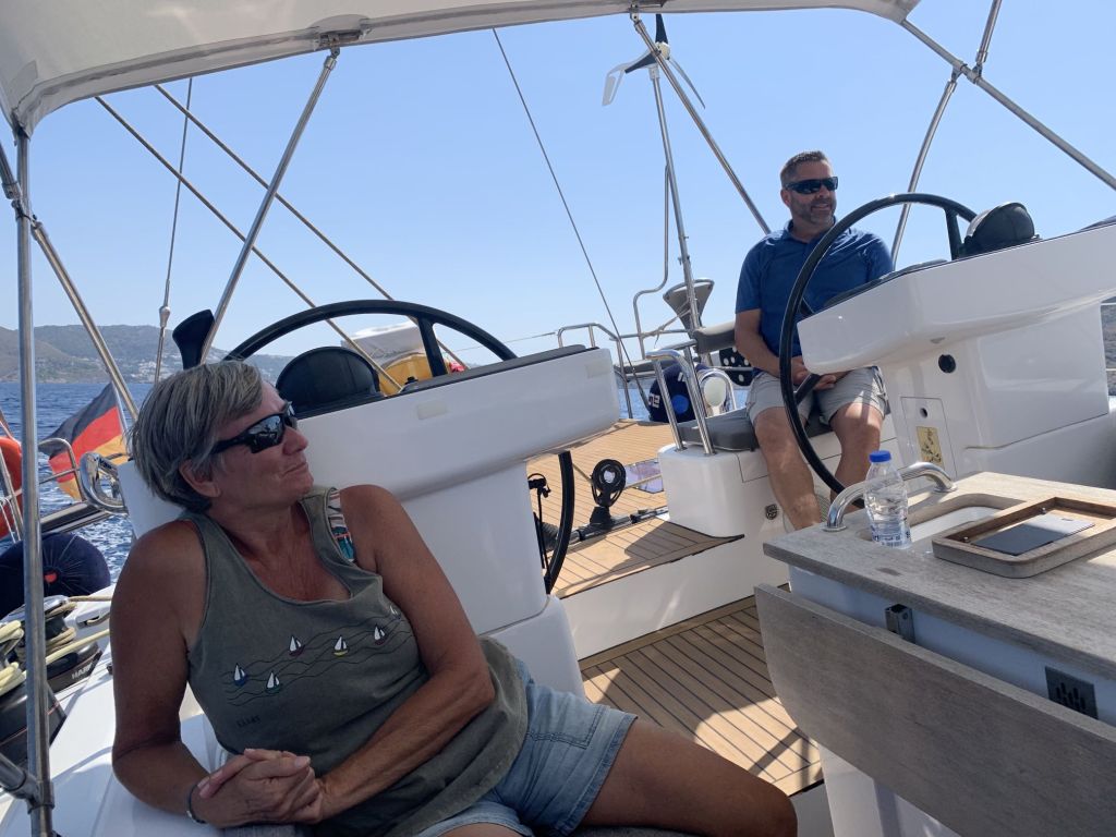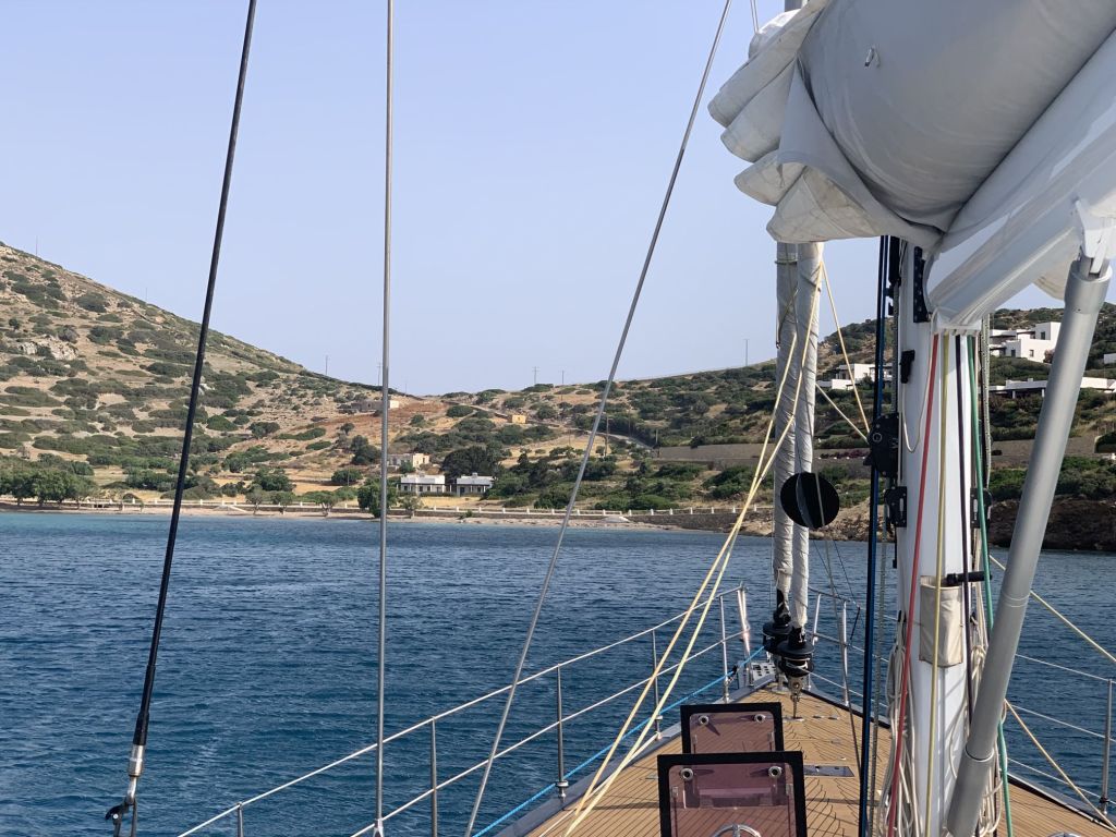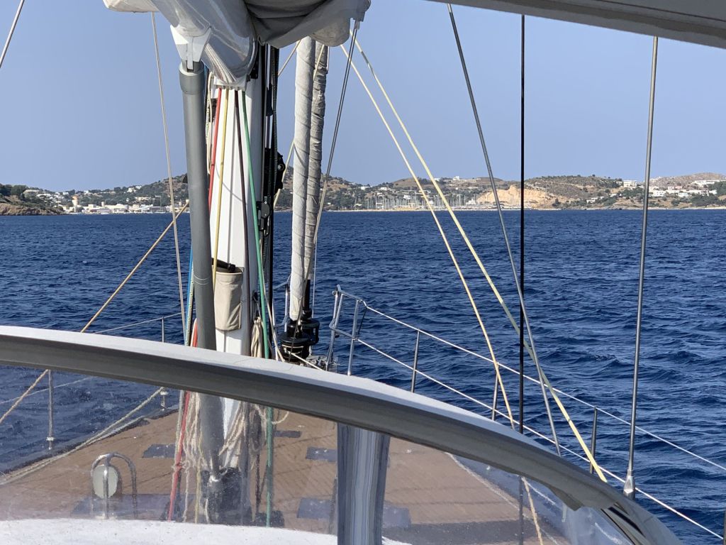 Wenn Ihr den Beitrag des letzten Monats gelesen habt wisst Ihr, dass Hans-Peter und ich die Gelegenheit hatten, mit Werner zusammen eine Testrunde zu segeln. Dies scheint Hans-Peter gefallen zu haben und er hat Sibylle und mich eingeladen, auch mit Petra und ihm einen Schlag zu segeln. Der Plan sah vor, die gleiche Wegstrecke zurückzulegen wie ein paar Wochen vorher mit Werner. Also Lakki, nordwärts, zwischen Leros und Archangelos durch, wieder südwärts bis in die Bucht von Alinda. Dort wollten wir bei Dimitris´ „To Steki“ essen, bevor wir mit dem Taxi zurückfahren.