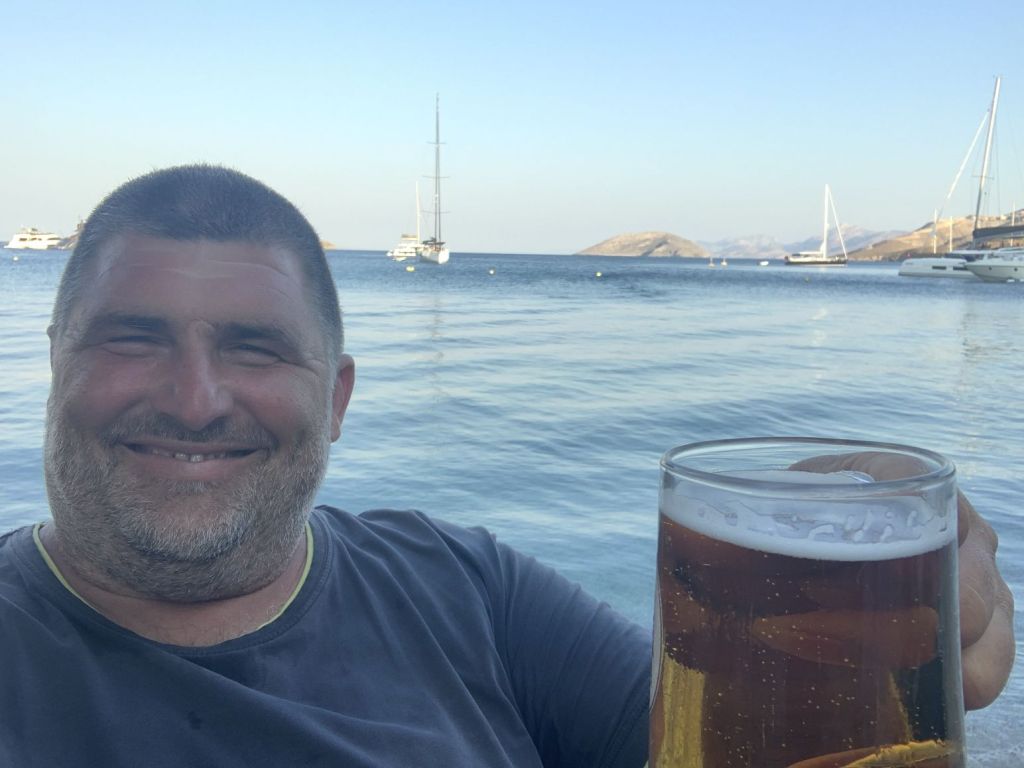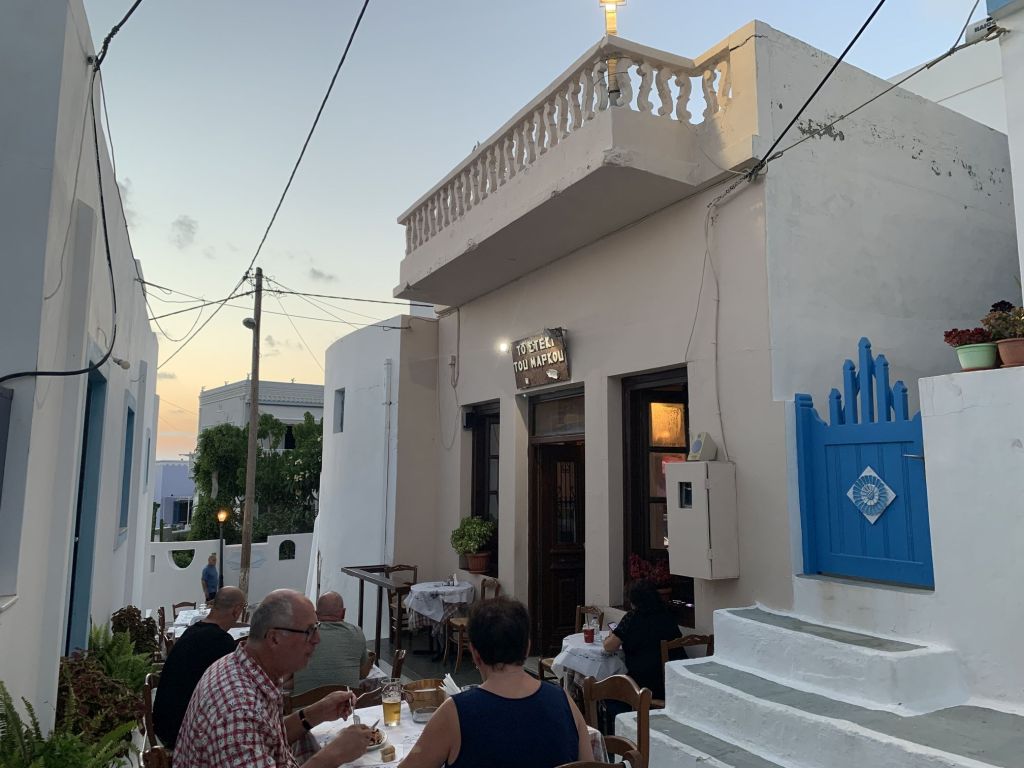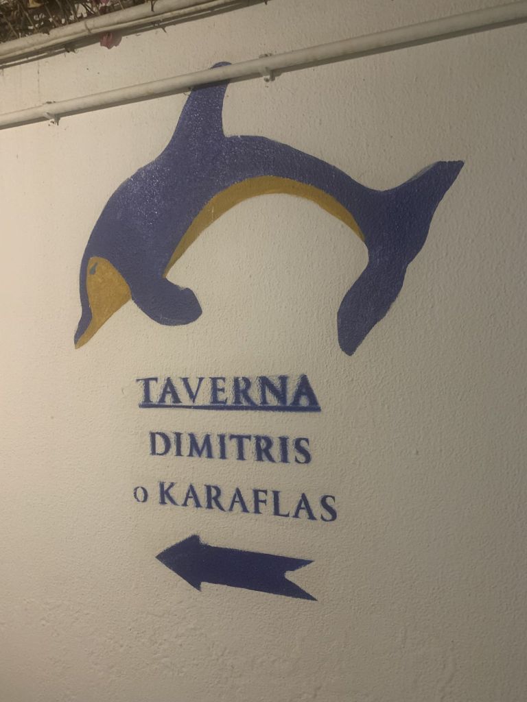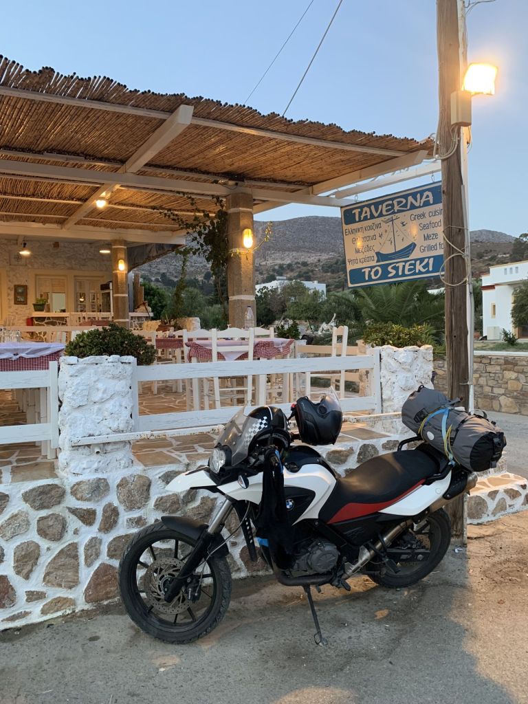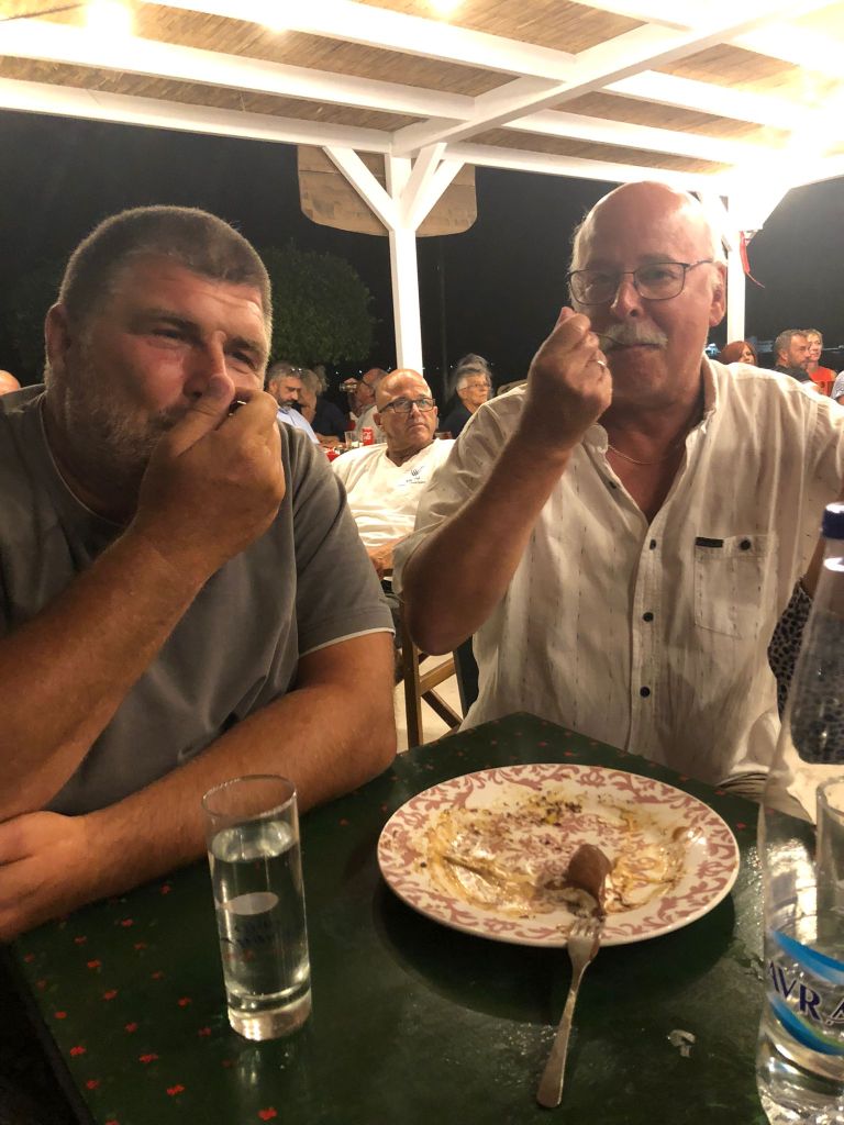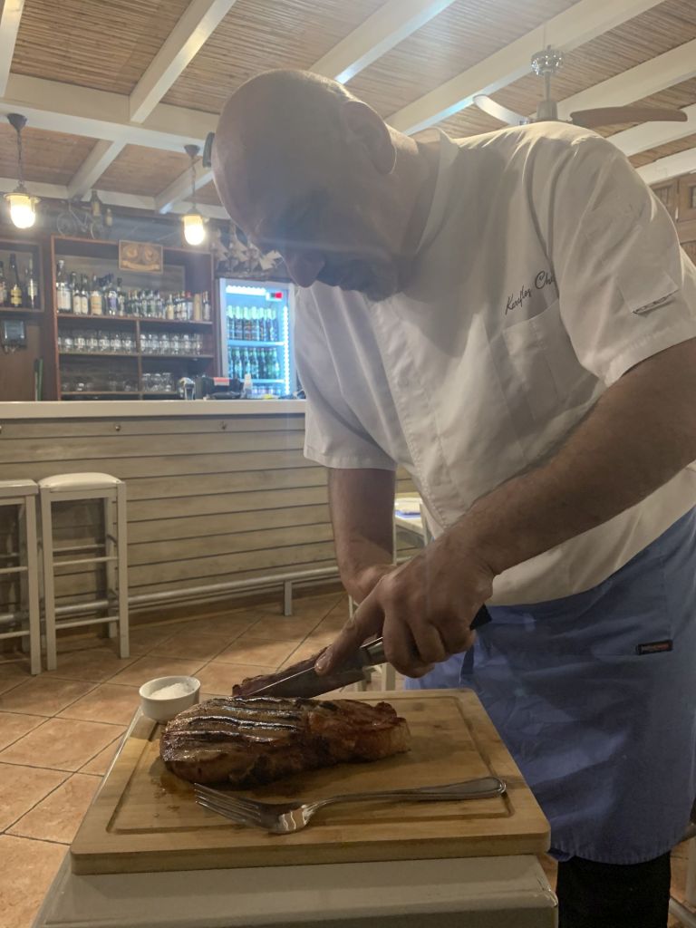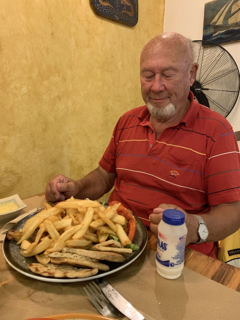Zum Dinner begibt man sich einmal mehr zum Glatzkopf, der sein Markenzeichen im Namen der Taverne verewigt hat „o Karaflas“ – hier mundet es heute vorzüglich! Der Skipper gönnt sich ein 1200g Steak.