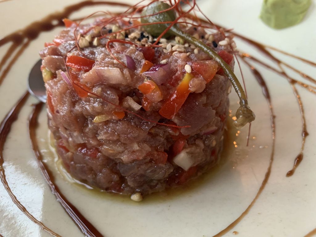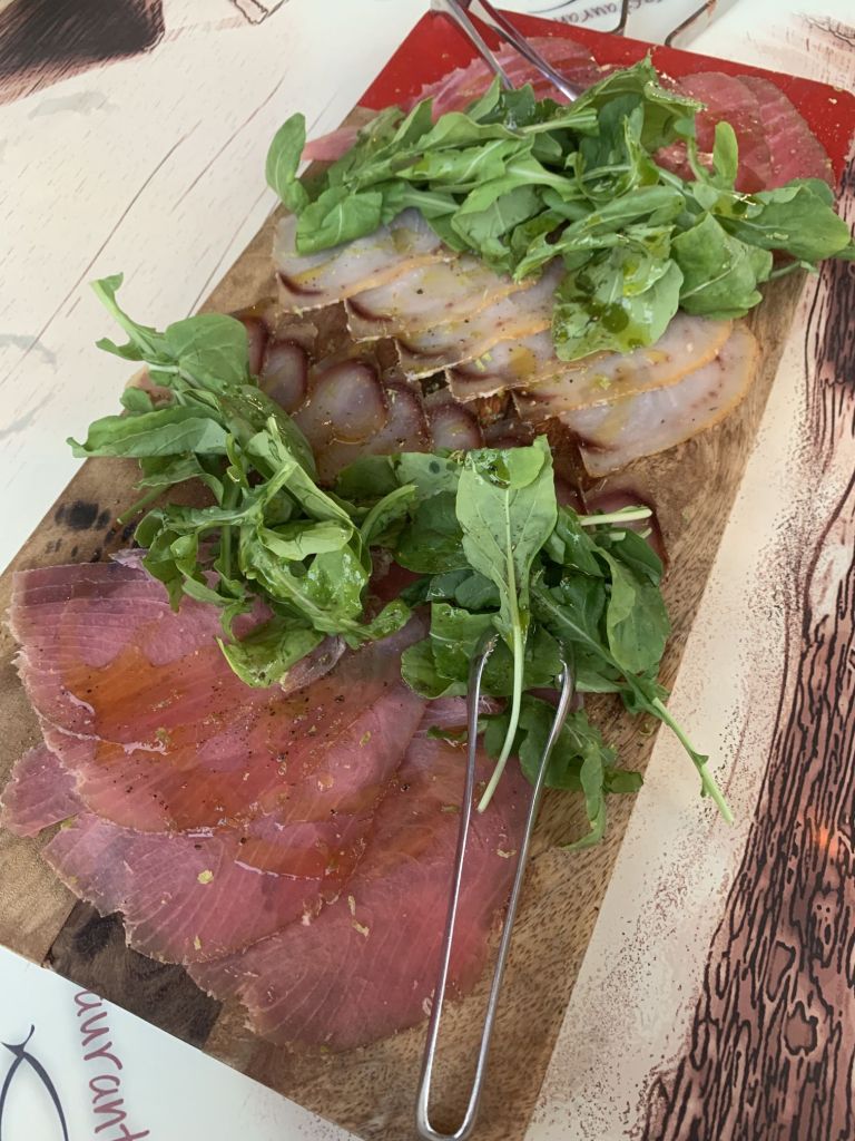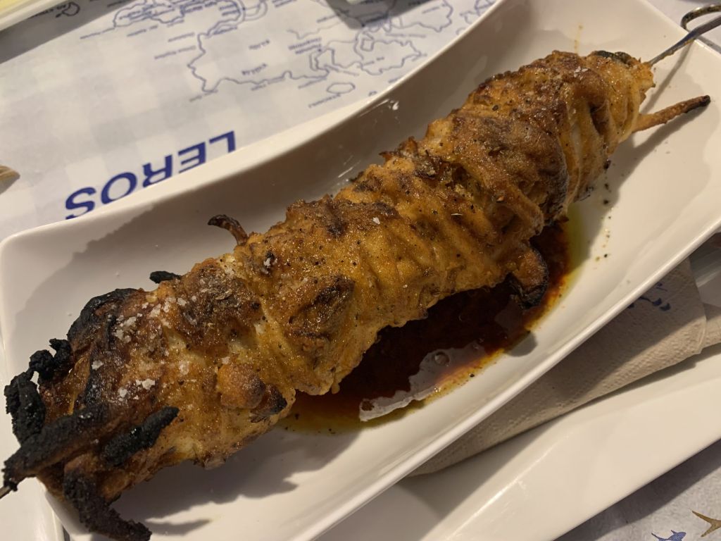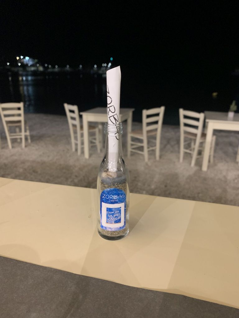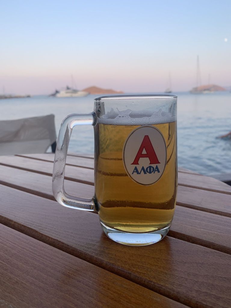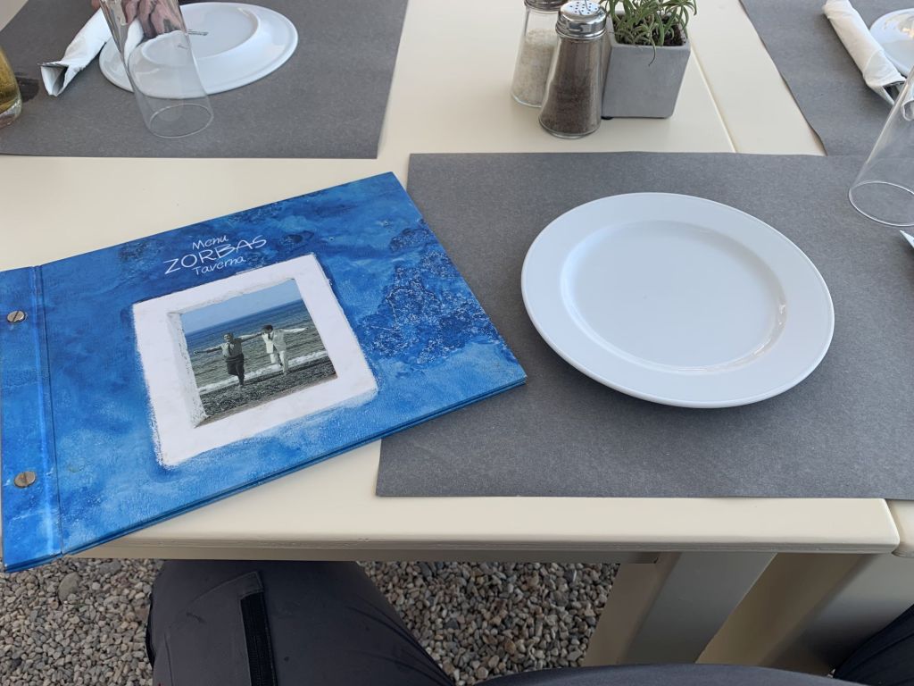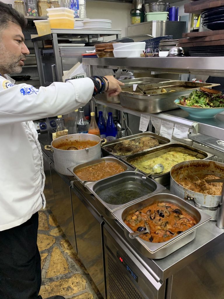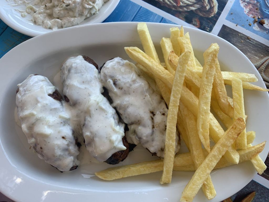 Zum Dinner begibt man sich einmal mehr zum Glatzkopf, der sein Markenzeichen im Namen der Taverne verewigt hat „o Karaflas“ – hier mundet es heute vorzüglich! Der Skipper gönnt sich ein 1200g Steak.